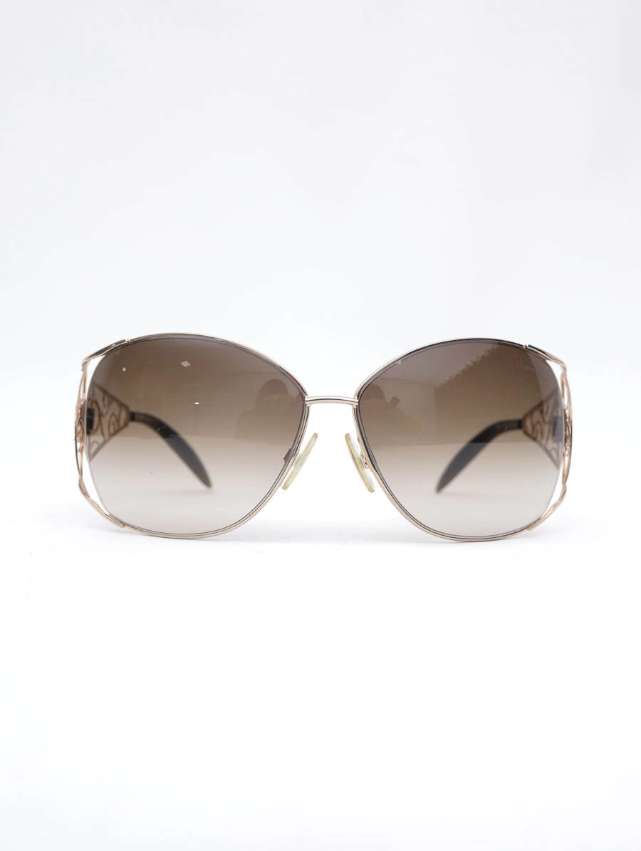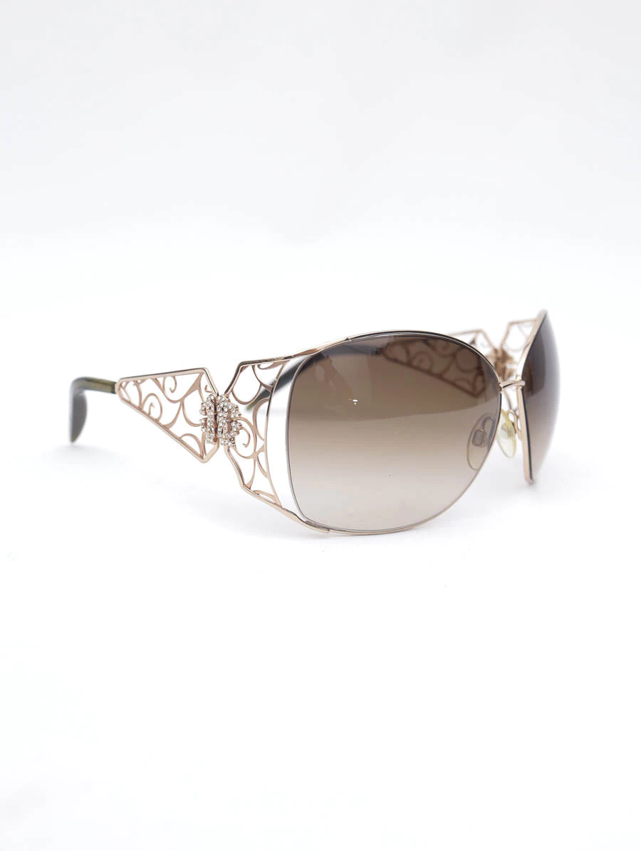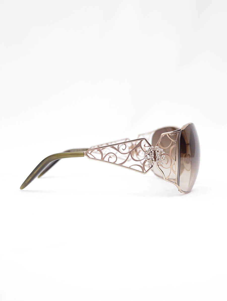 Óculos de Sol Roberto Cavalli Targelle com armação em metal dourado e detalhe na ponta das hastes em acetato na cor verde musgo. Apresenta decorações arabescas em metal nas laterais e nas hastes, lentes em degradê e aplicações de pedrinhas nas laterais.