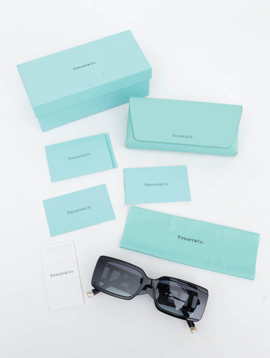 Óculos de Sol Seminovo Original Tiffany&Co TF4197 com armação em acetato preto, detalhes em metal nas laterais e lentes degrades. Em excelente estado de conservação, sem sinais de uso.