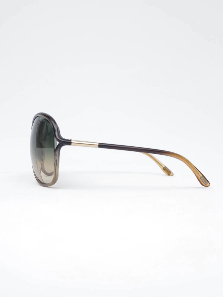 Óculos de Sol Tom Ford Vichycom armação em acetato na cor marrom, lentes em degrade e detalhes em dourado nas hastes. Está em ótimo estado de conservação,apresenta mínimos risquinhos na armação.