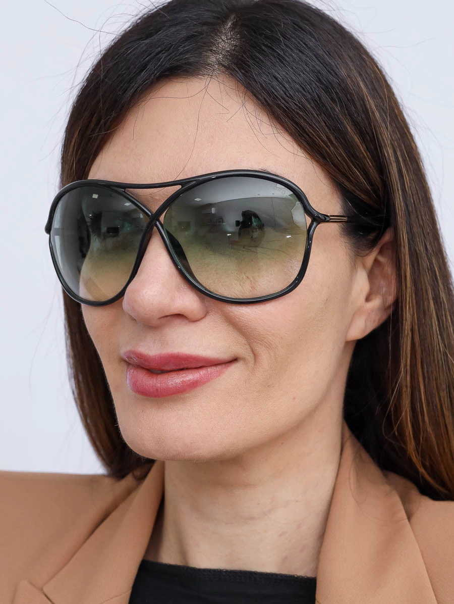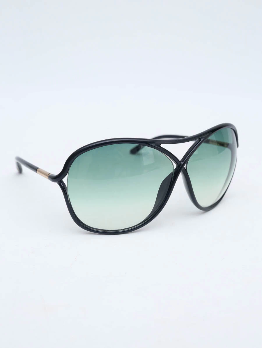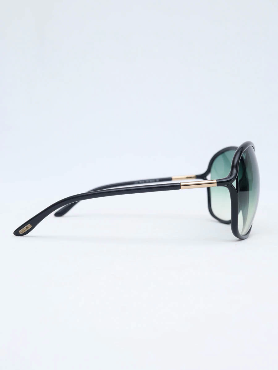 Óculos de Sol Tom Ford Vicky TF184 com armação em acetato na cor preta, detalhe em metal dourado nas hastes e lentes em degradê em um leve tom de verde. Em excelente estado de conservação, com pequenos sinais de uso.