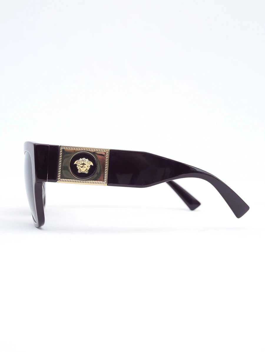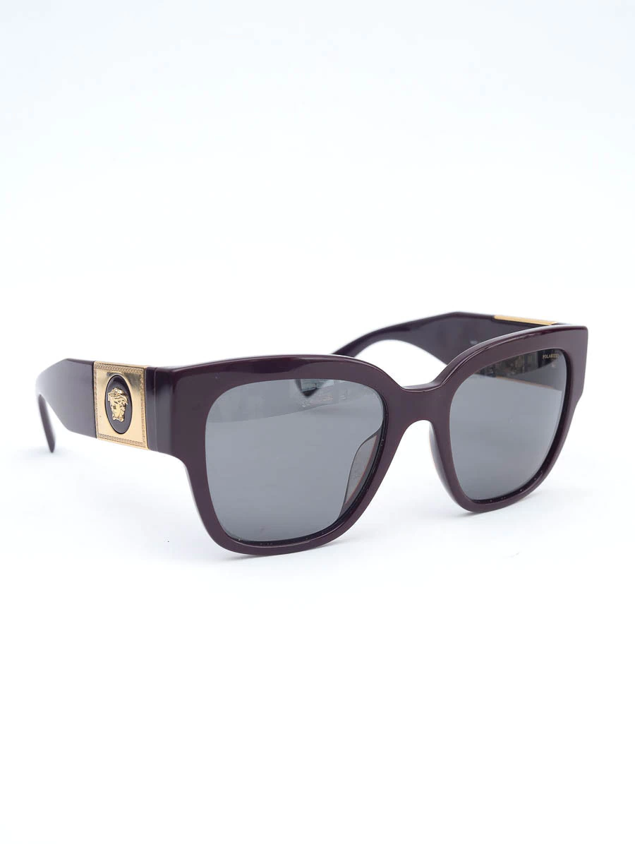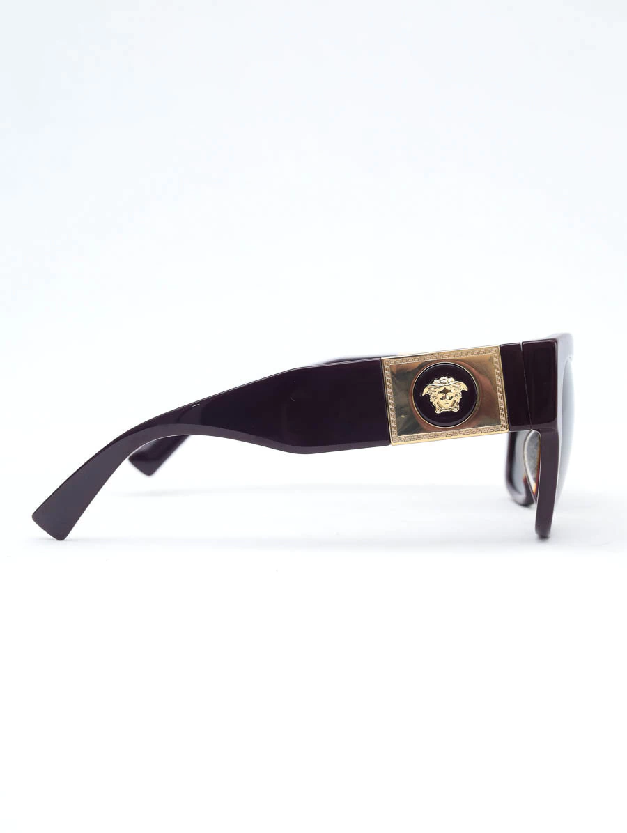 Óculos de Sol Seminovo Original Versace MOD 4437U com armação em acetato na cor vinho, lentes transparentes pretas, detalhe com o logotipo da marca em metais dourados nas hastes.