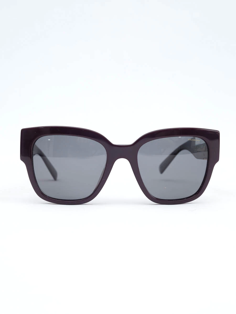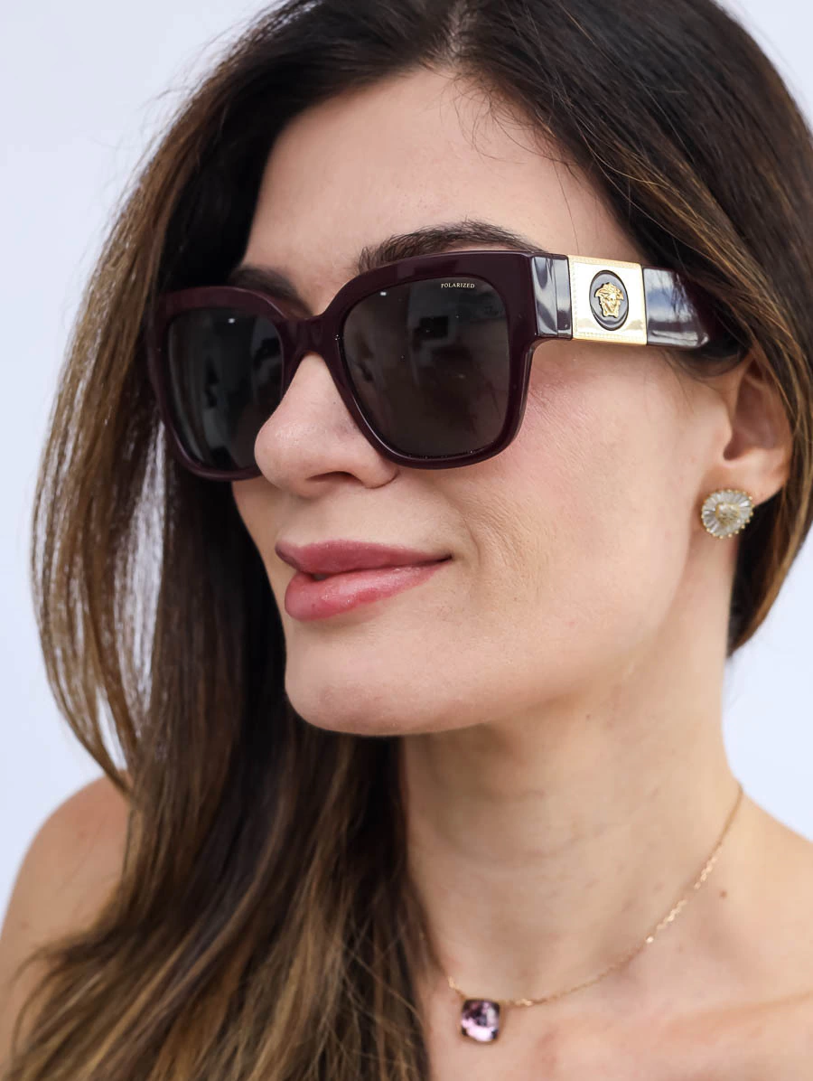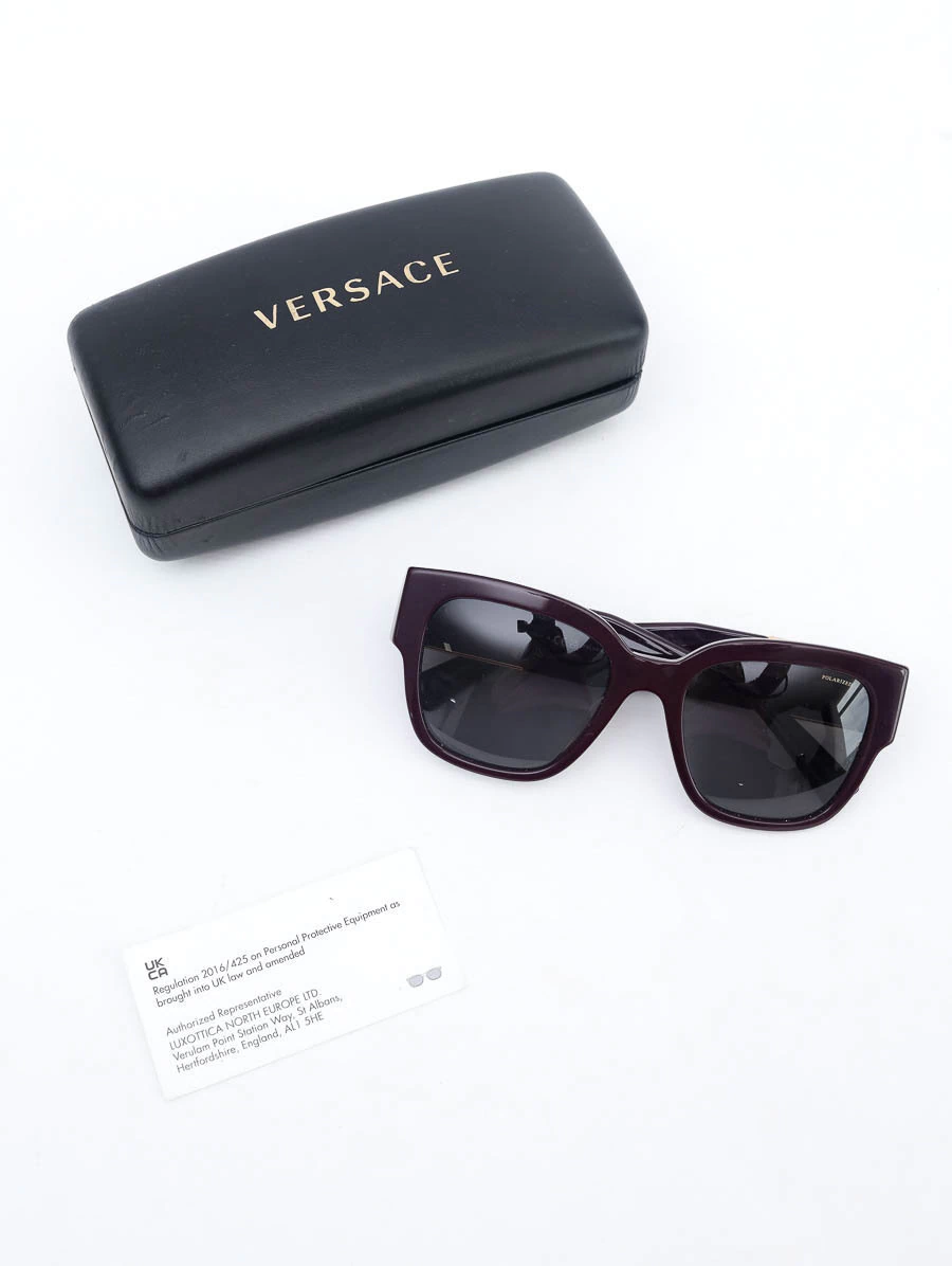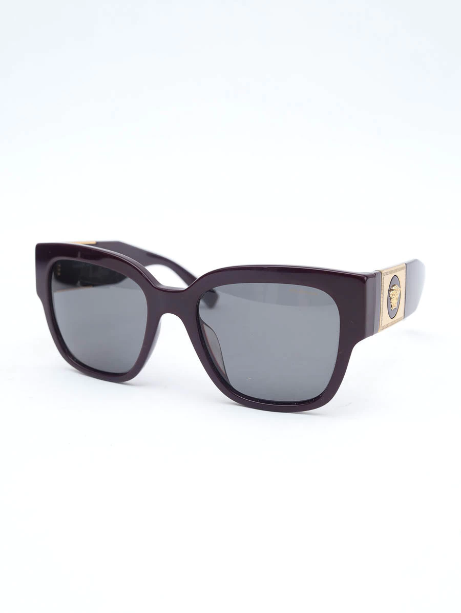 Óculos de Sol Seminovo Original Versace MOD 4437U com armação em acetato na cor vinho, lentes transparentes pretas, detalhe com o logotipo da marca em metais dourados nas hastes.