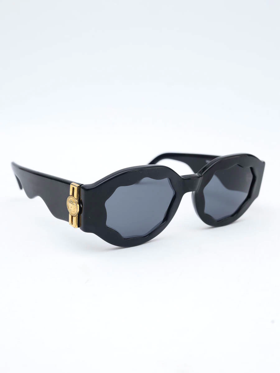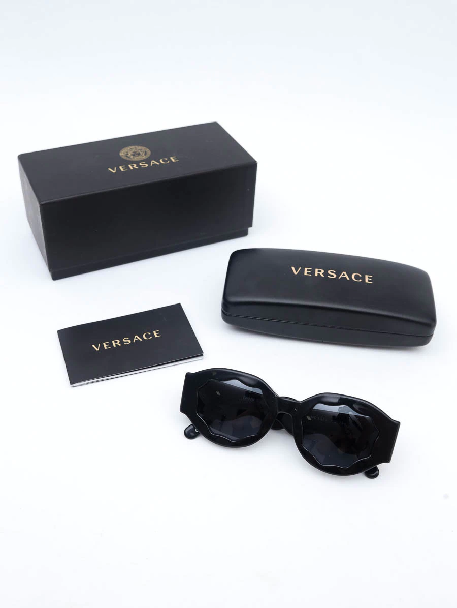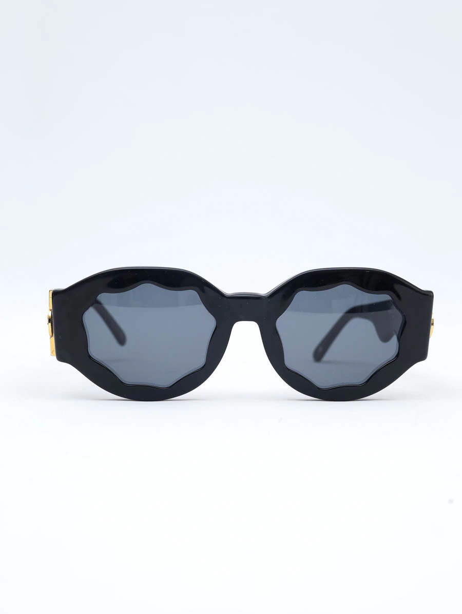 Óculos de Sol Seminovo Original Versace MODS13 com armação em acetato na cor preta, lentes também pretas, ondulações na armação toda e lindo detalhe com o logotipo da marca com metais dourados nas hastes.