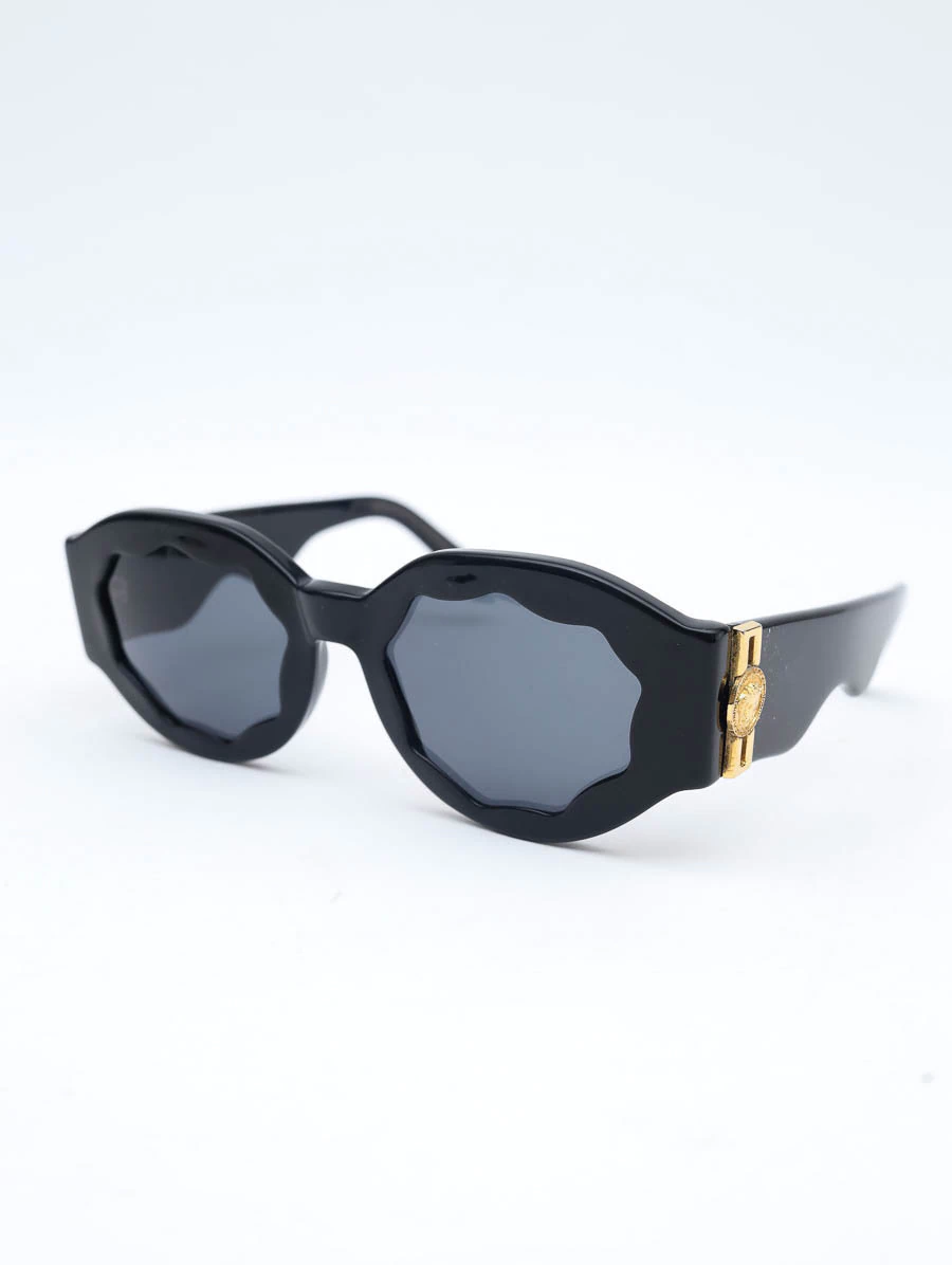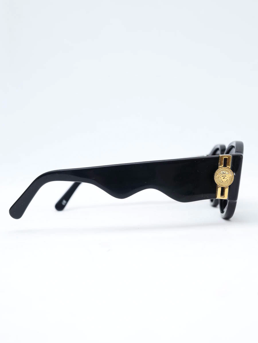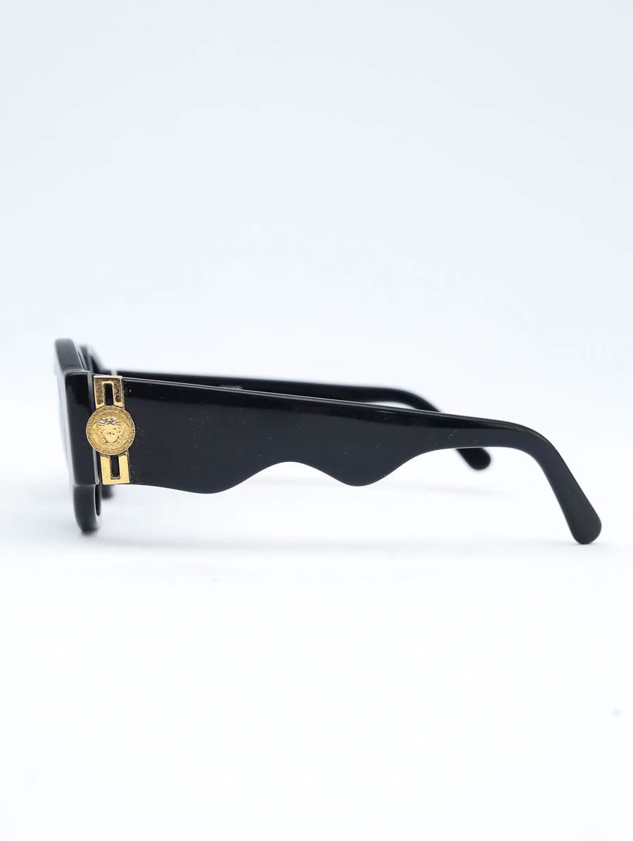 Óculos de Sol Seminovo Original Versace MODS13 com armação em acetato na cor preta, lentes também pretas, ondulações na armação toda e lindo detalhe com o logotipo da marca com metais dourados nas hastes.