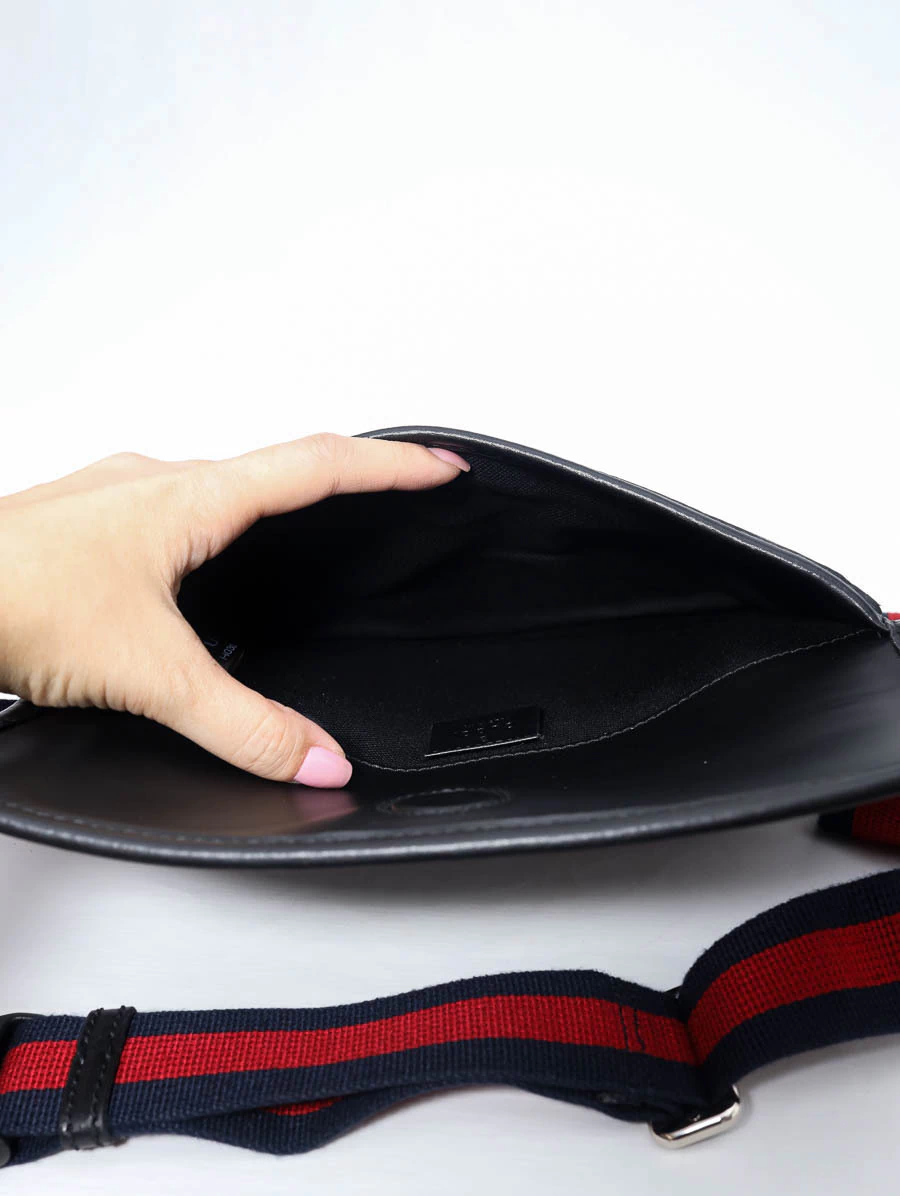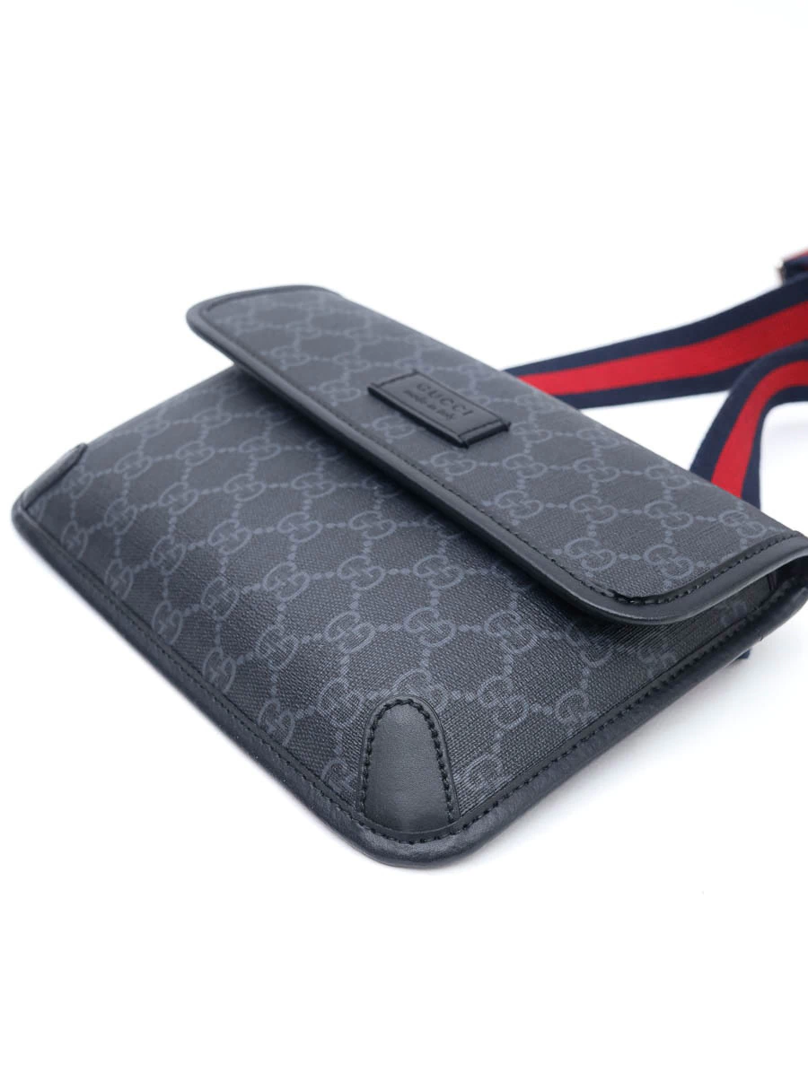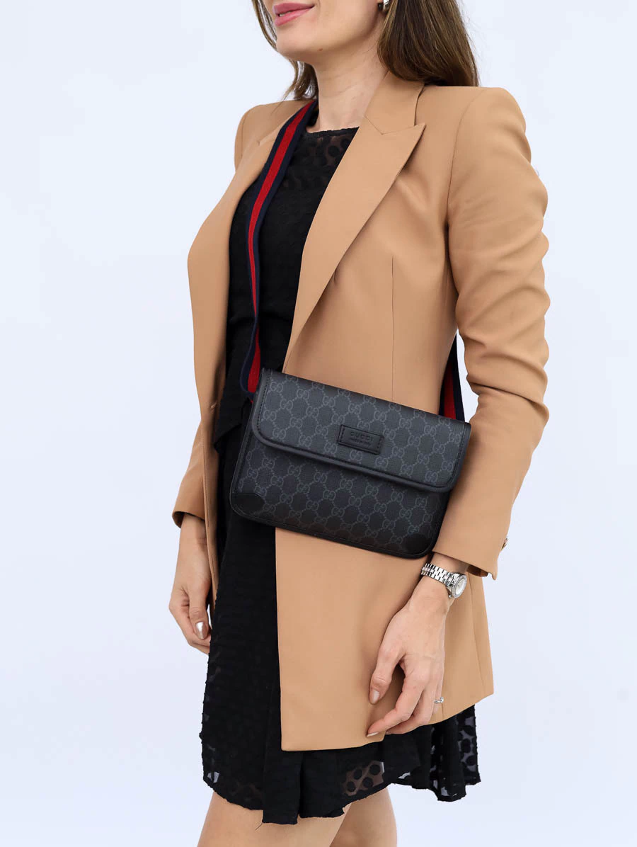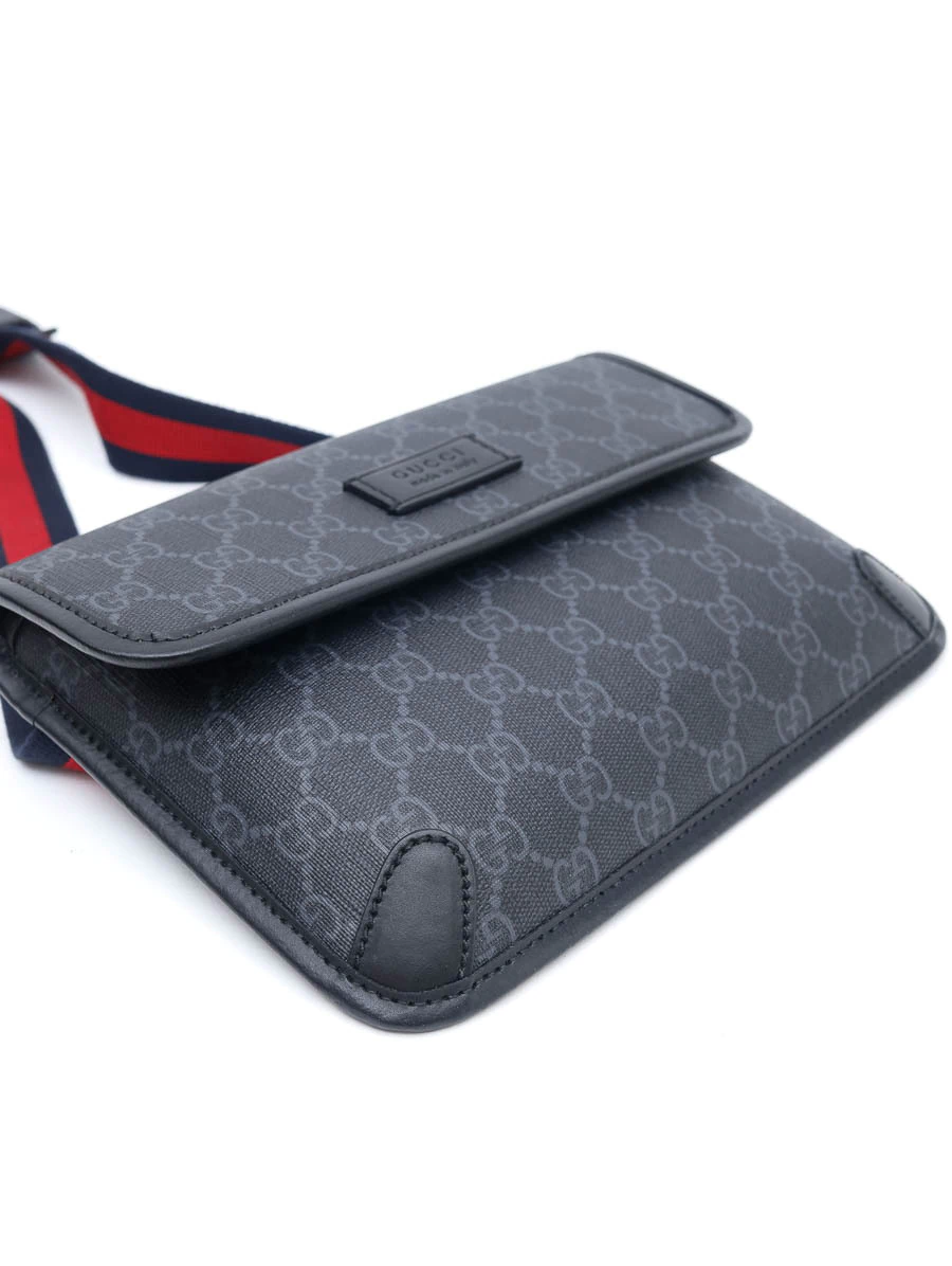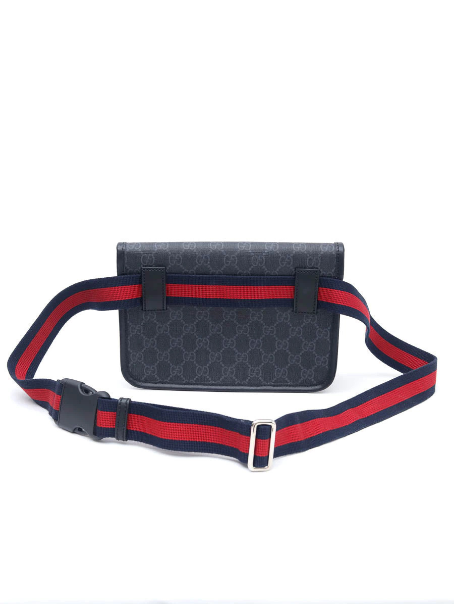 Pochete Gucci GG Supreme Belt Bag produzida em Canvas com estampa GG Supreme e couro calfskin preto com faixa Web.Apresenta abertura através de uma aba flap com fecho magnético de contato, ferragens prateadas e compartimento único, além da alça de cintura regulável e removível.