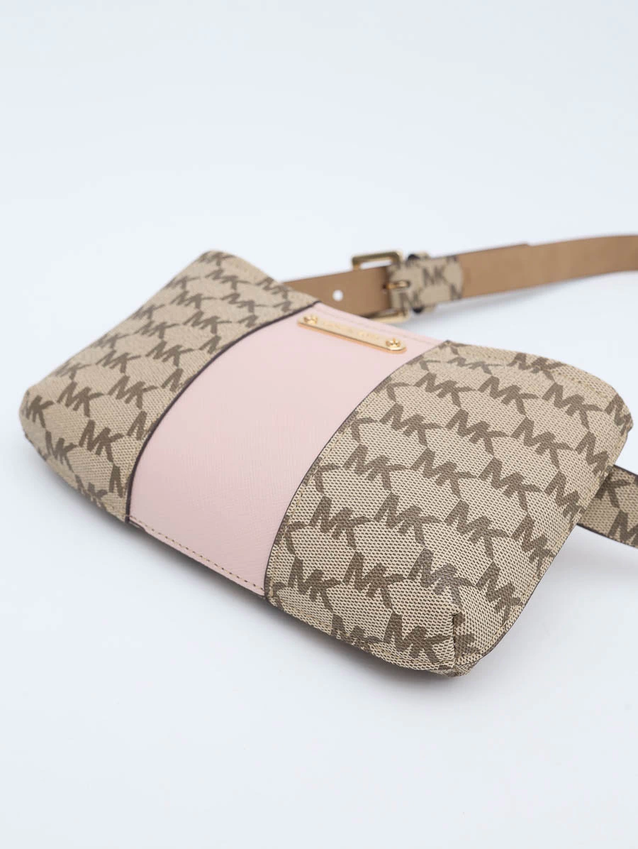 A Pochete Michael Michael Kors Belt Bag Fanny é a união perfeita entre praticidade e sofisticação.Confeccionada em couro e canvas nas cores bege e rosa com a icônica estampa monograma MK, apresenta ferragens douradas que adicionam um toque de elegância ao acessório.Seu design retangular é complementado por um fechamento superior em zíper metálico dourado, garantindo segurança aos seus pertences.A alça de corrente ajustável permite versatilidade no uso, podendo ser utilizada como pochete ou bolsa transversal.Ideal para quem busca um acessório funcional sem abrir mão do estilo.