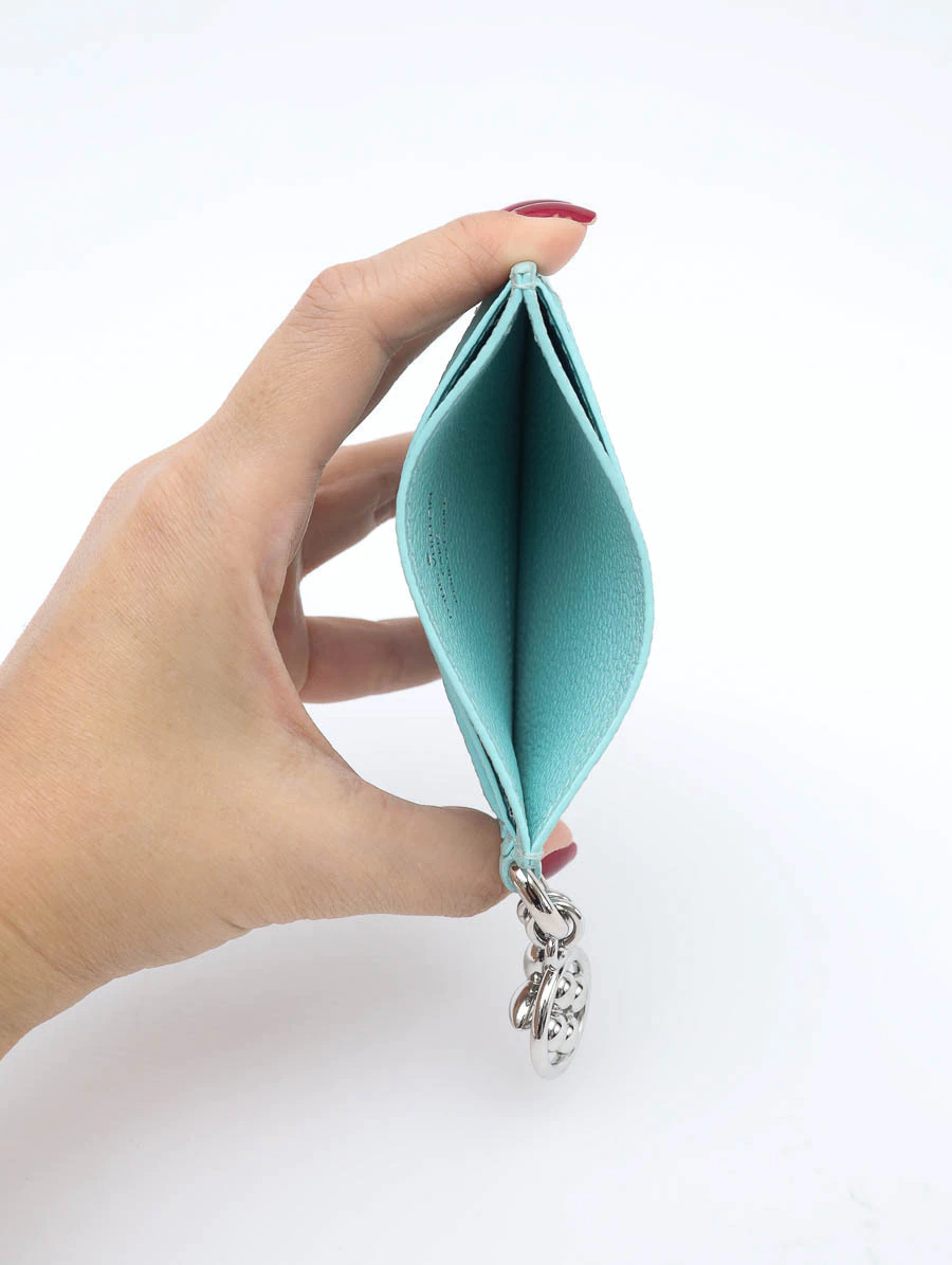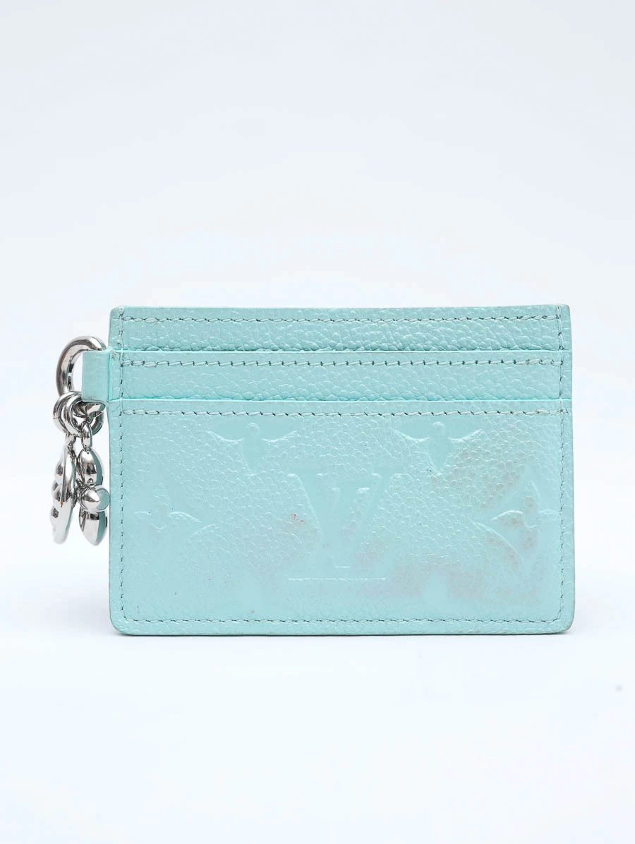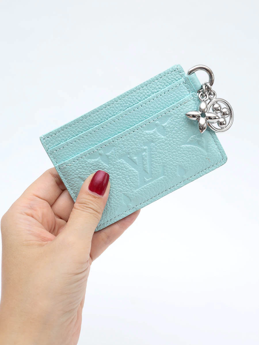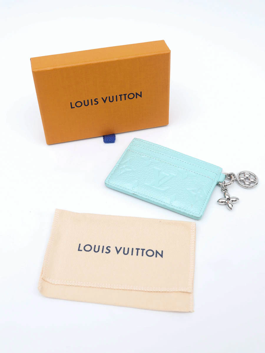 Porta-cartão Louis Vuitton Charms é uma peça super versátil para levar seus cartões e documentos. Produzida em couro Louis Vuitton na cor turquesa brilhante, possui slots para cartões e um compartimento interno.