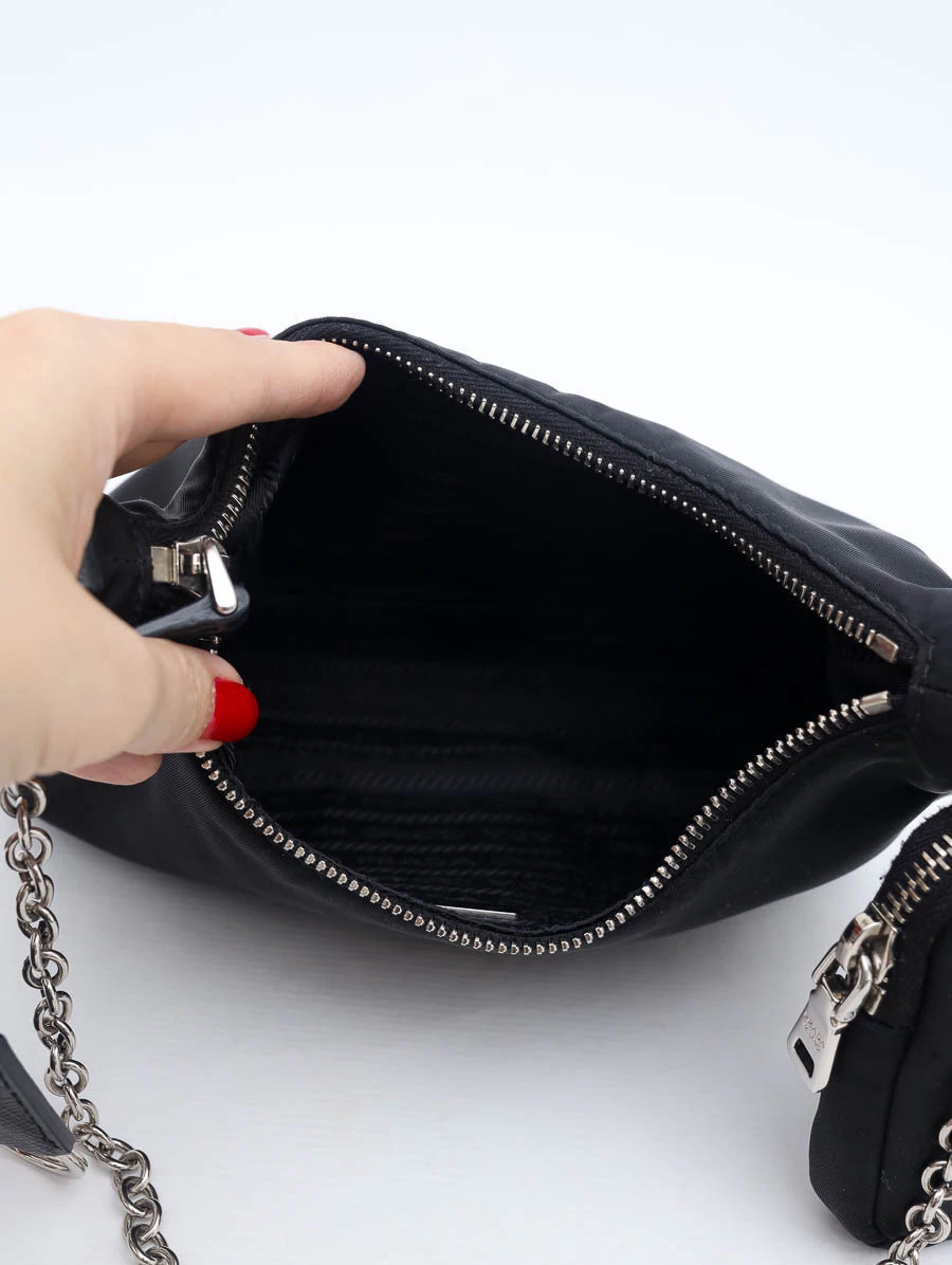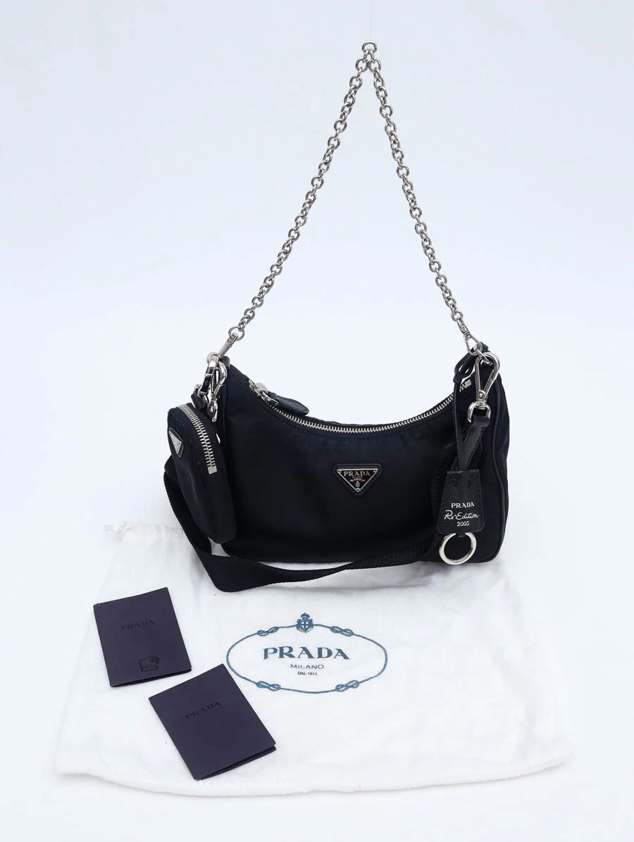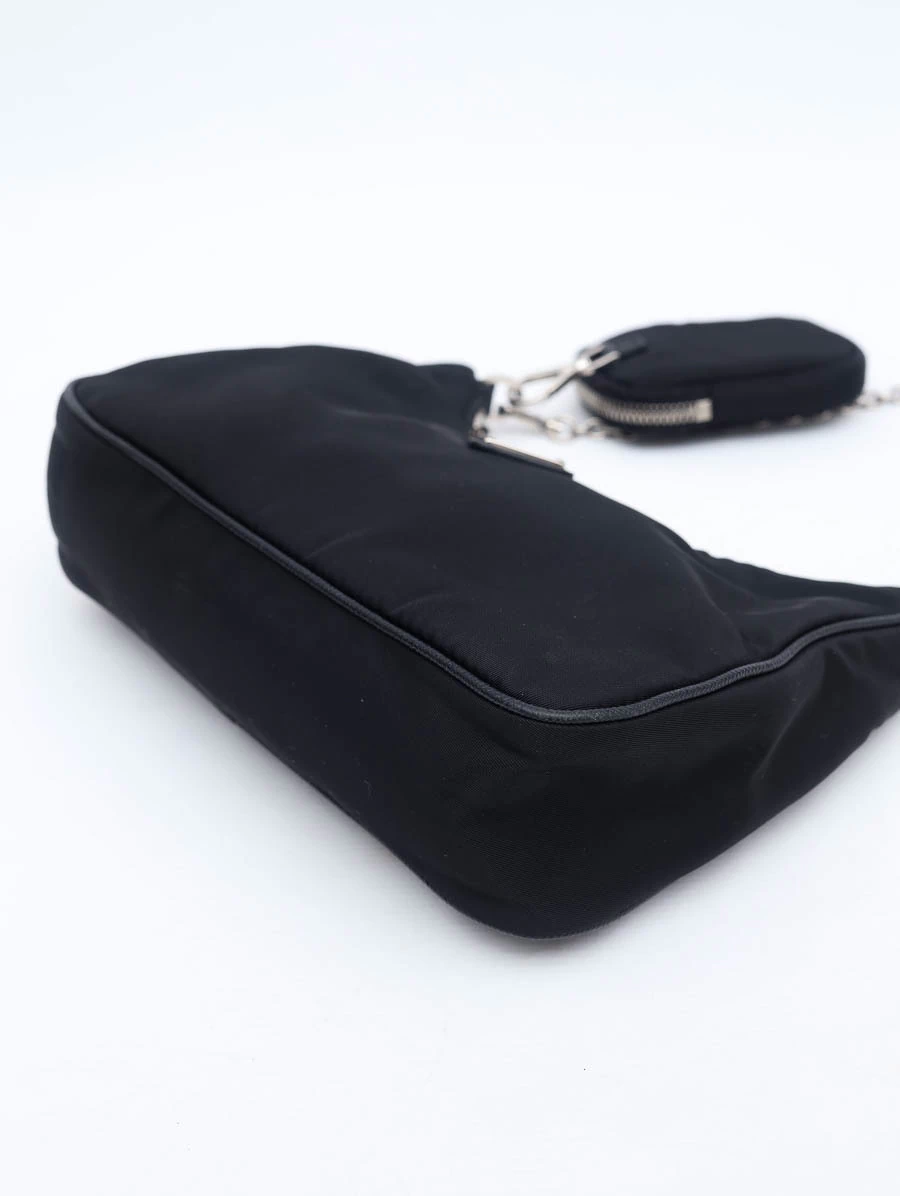 Está icônica e Autêntica Prada 2005 Re-Edition produzida em Re-Nylon: um fio de nylon regenerado (ECONYL®) obtido por meio da reciclagem e purificação de resíduos plásticos coletados de oceanos, redes de pesca e fibras têxteis e acabamentos em couro preto Saffiano, acompanha uma mini nécessaire removível na alça longa e uma pequena alça de ombro em correntes.bro.
