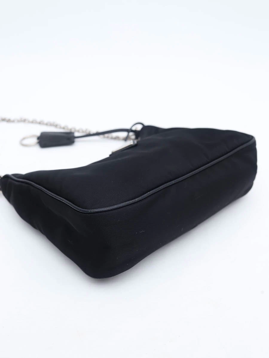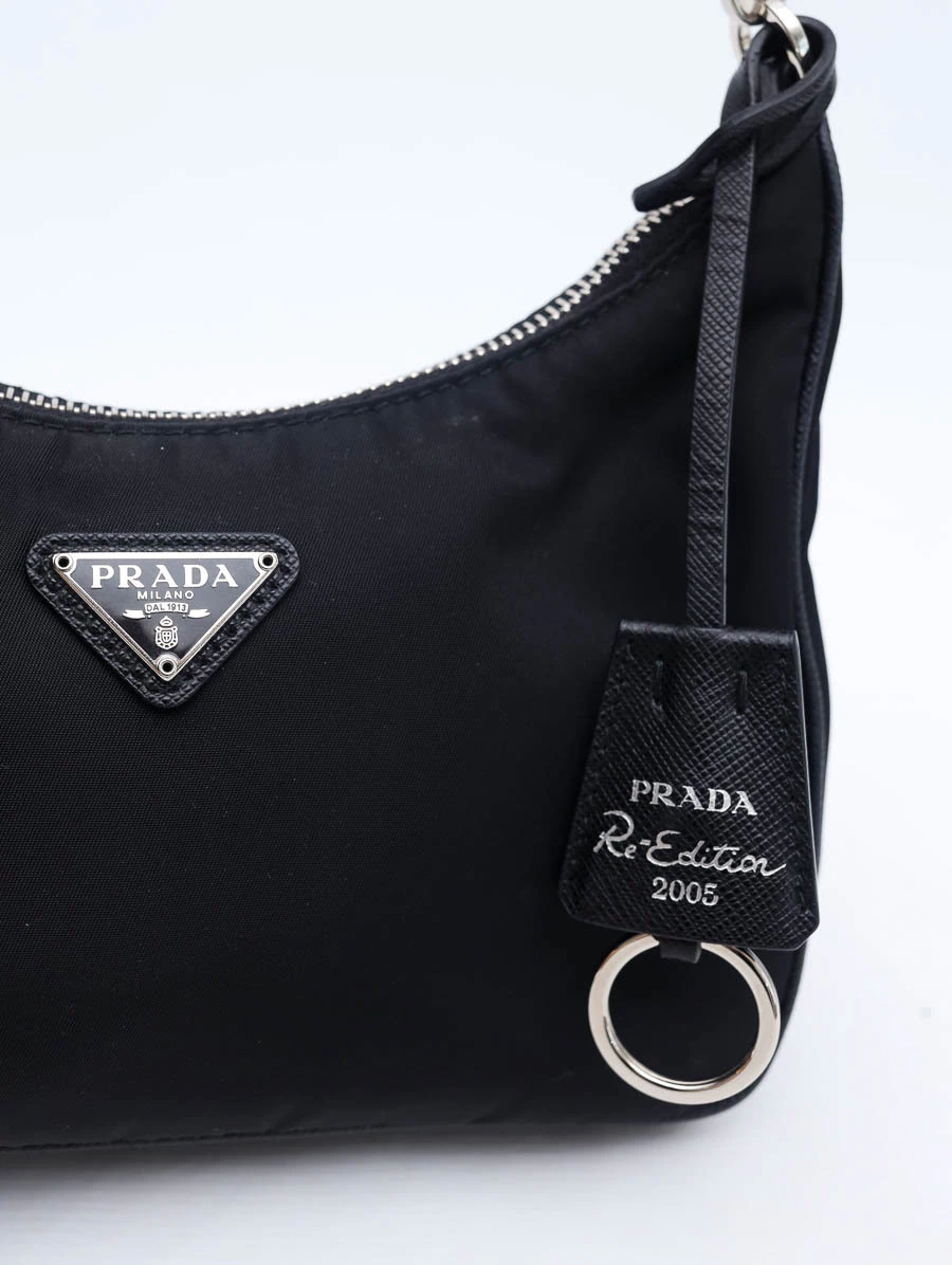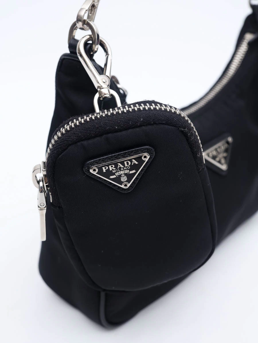 Está icônica e Autêntica Prada 2005 Re-Edition produzida em Re-Nylon: um fio de nylon regenerado (ECONYL®) obtido por meio da reciclagem e purificação de resíduos plásticos coletados de oceanos, redes de pesca e fibras têxteis e acabamentos em couro preto Saffiano, acompanha uma mini nécessaire removível na alça longa e uma pequena alça de ombro em correntes.bro.