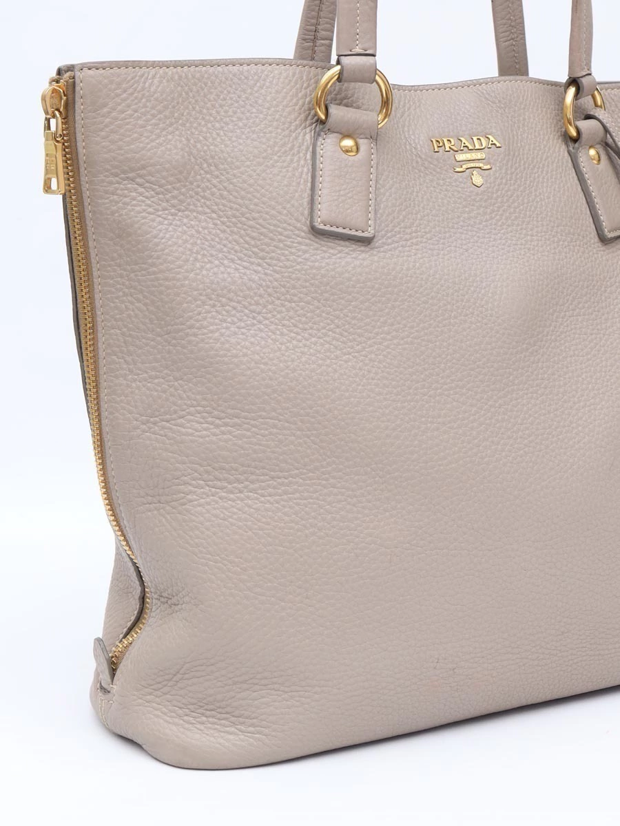 A Bolsa Autêntica Prada Vitello Phenix Shopping Tote é perfeita para uso diário e pode ser a sua bolsa preferida para levar ao trabalho ou passeios e compras. Com excelente espaço interno e alças de ombro muito confortáveis, o modelo é confeccionado em couro de vitelo texturizado na cor cinza com ferragens douradas e apresenta zípers laterais que possibilitam a expansão do espaço interno para maior armazenamento, abertura superior com com fecho de pressão, dois bolsos internos abertos e um bolso grande com zíper.