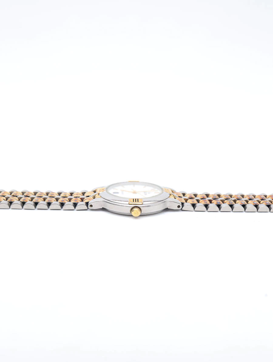 Relógio Seminovo Original Bulova Quartz fabricado em aço com banho prata e detalhes dourados e modelo de caixa redonda médio. Possui fundo do visor branco, fecho por encaixe, marcador de data, ponteiros de horas, minutos e segundos.