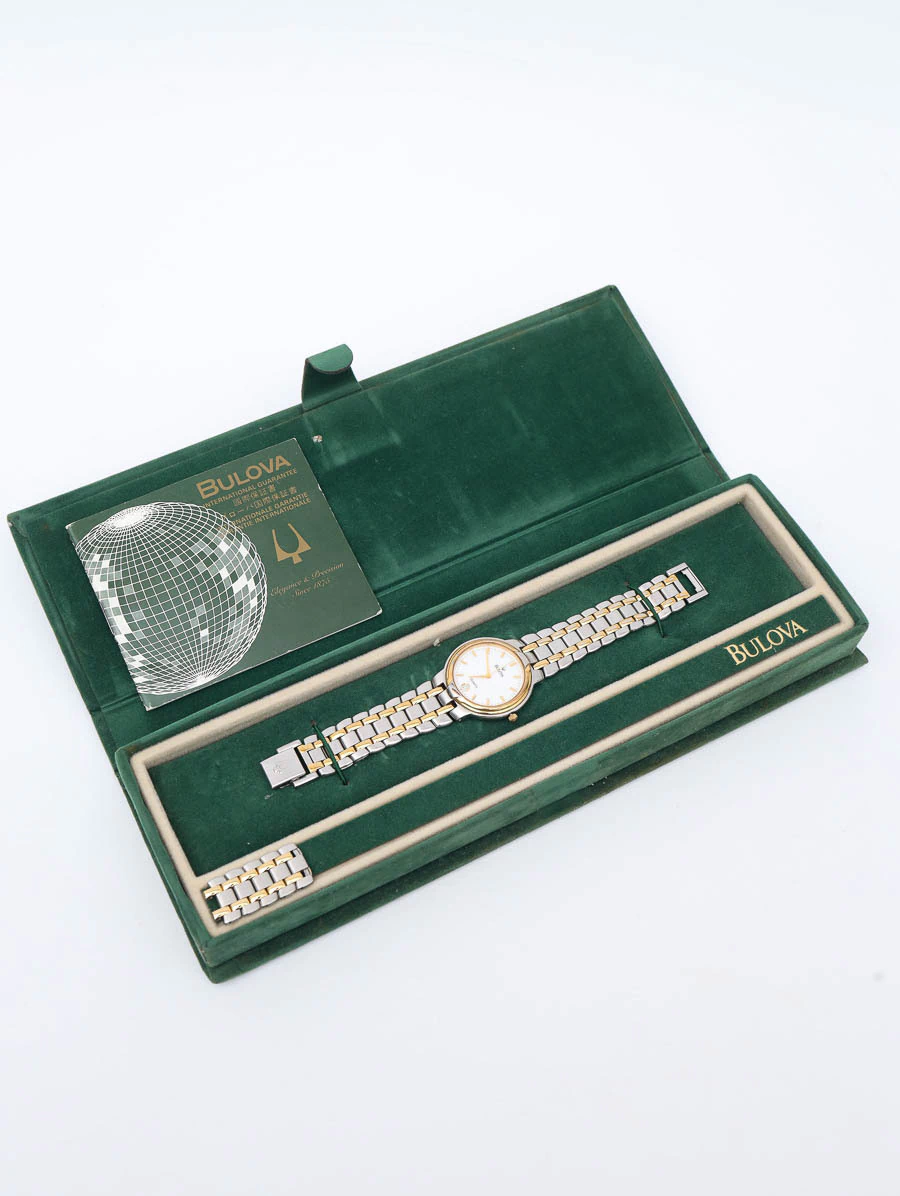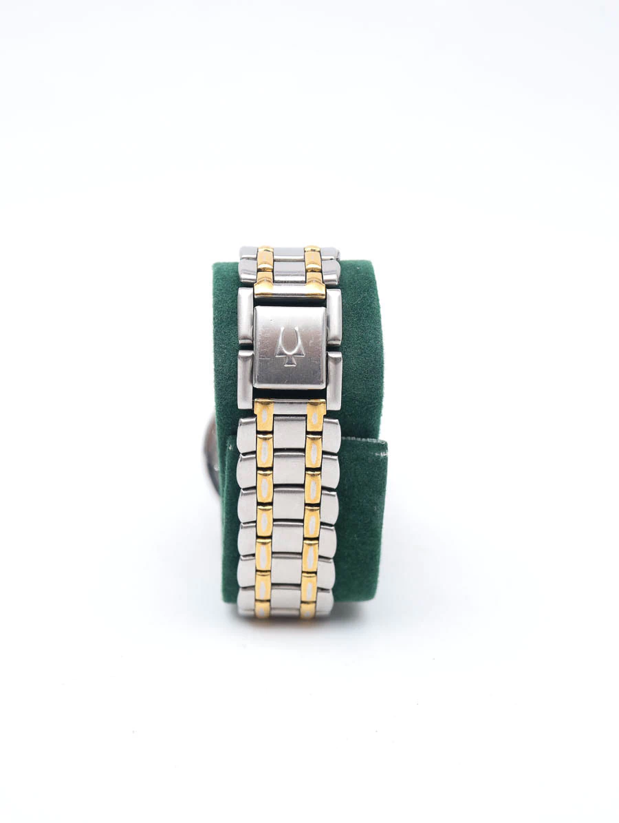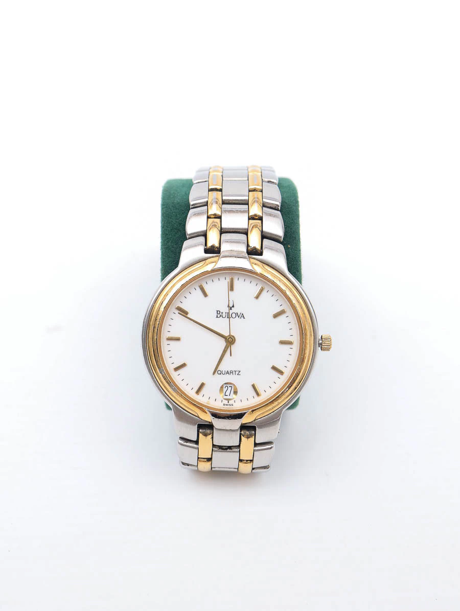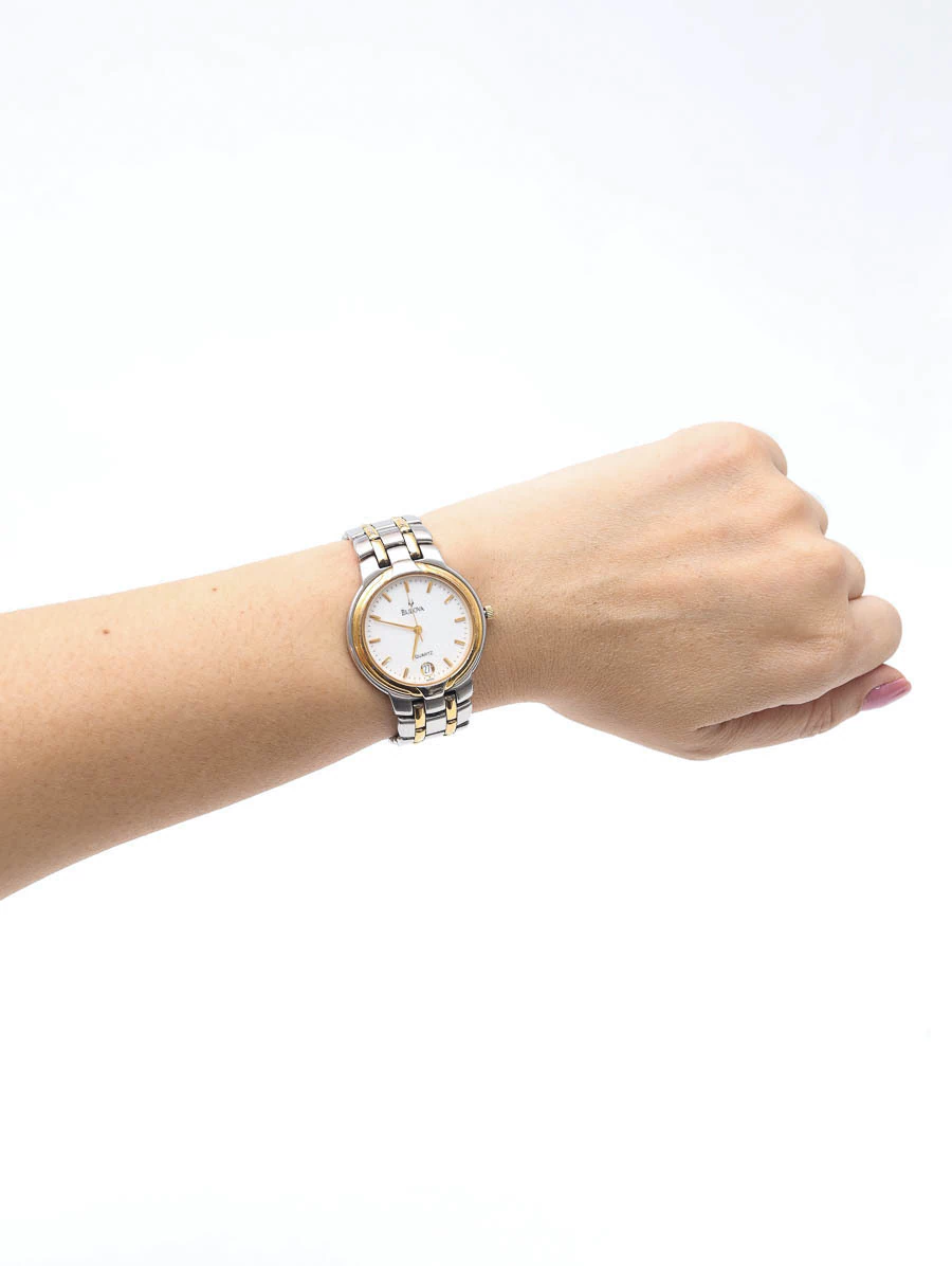 Relógio Seminovo Original Bulova Quartz fabricado em aço com banho prata e detalhes dourados e modelo de caixa redonda médio. Possui fundo do visor branco, fecho por encaixe, marcador de data, ponteiros de horas, minutos e segundos.