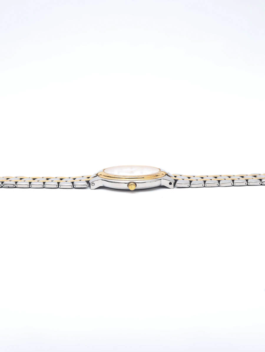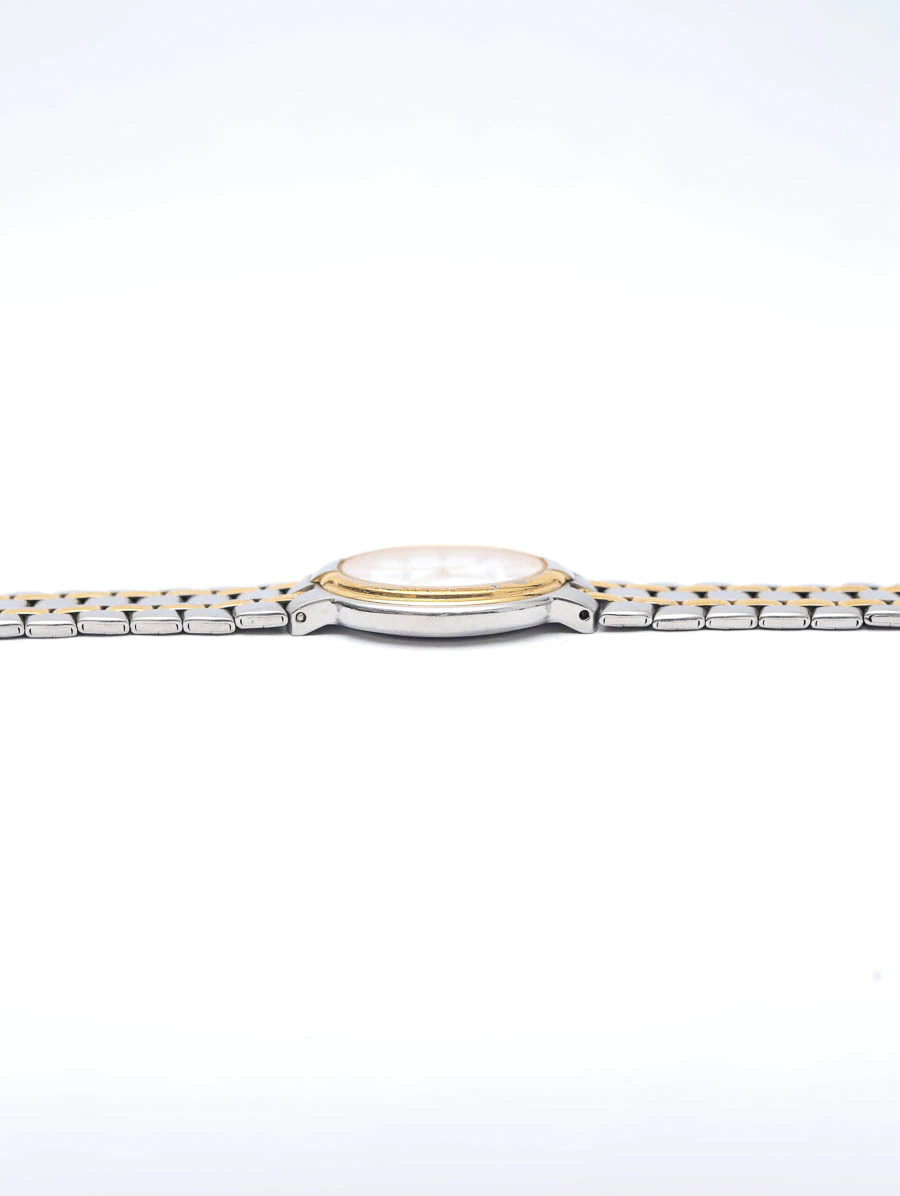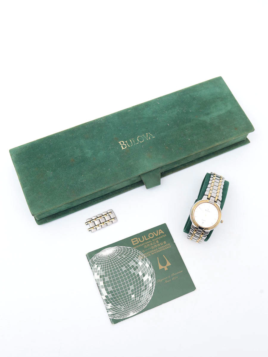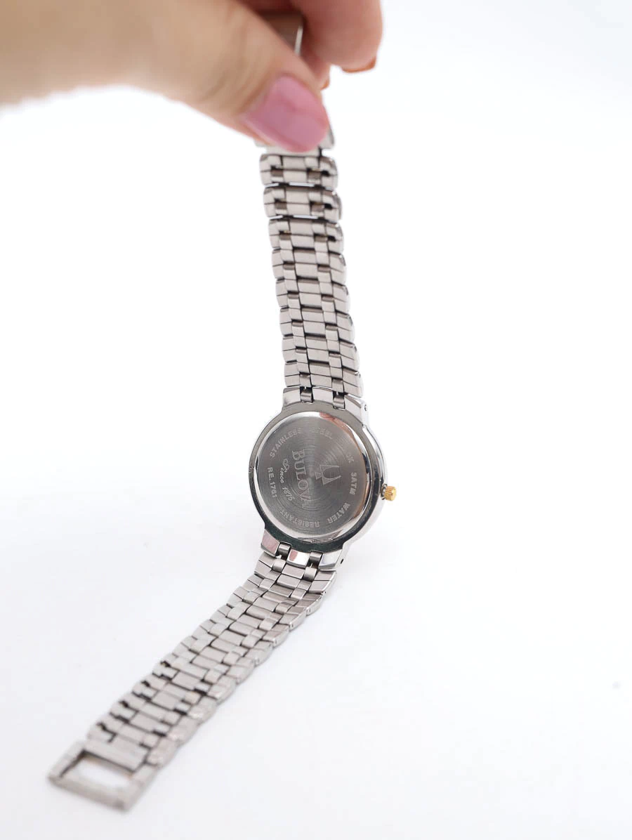 Relógio Seminovo Original Bulova Quartz fabricado em aço com banho prata e detalhes dourados e modelo de caixa redonda médio. Possui fundo do visor branco, fecho por encaixe, marcador de data, ponteiros de horas, minutos e segundos.