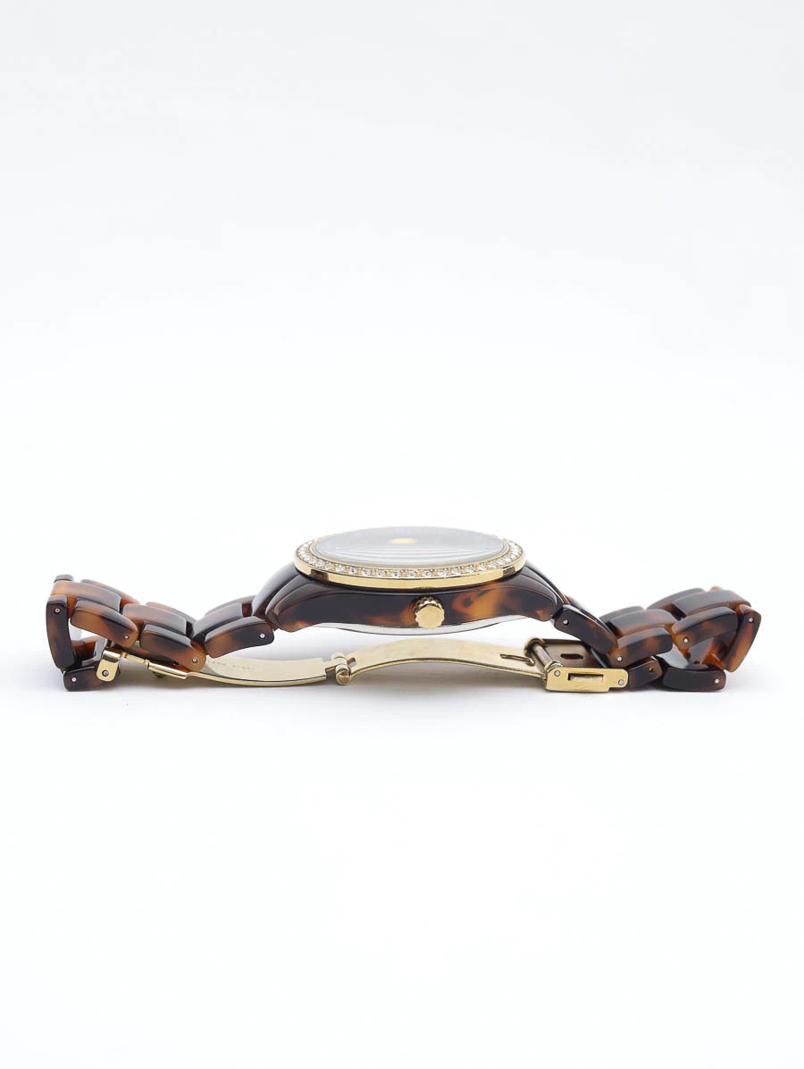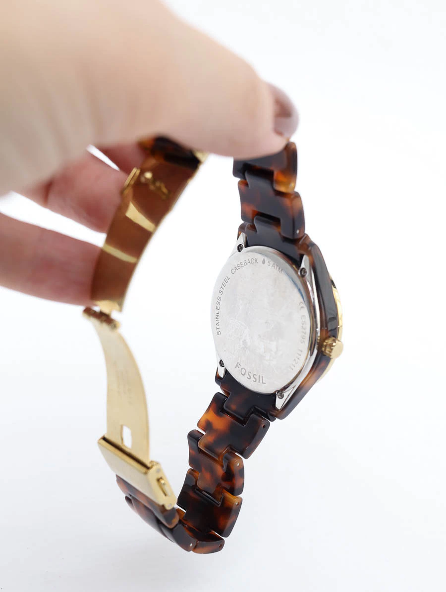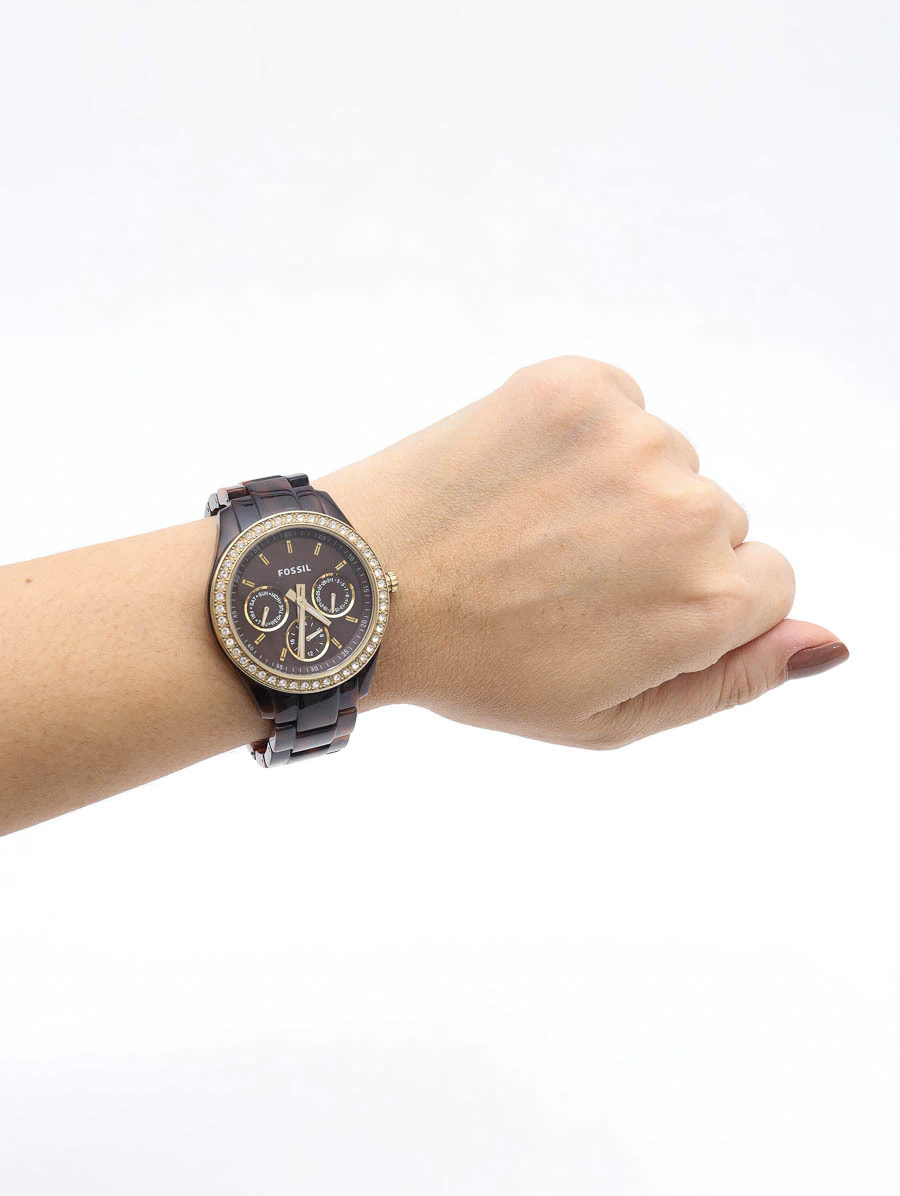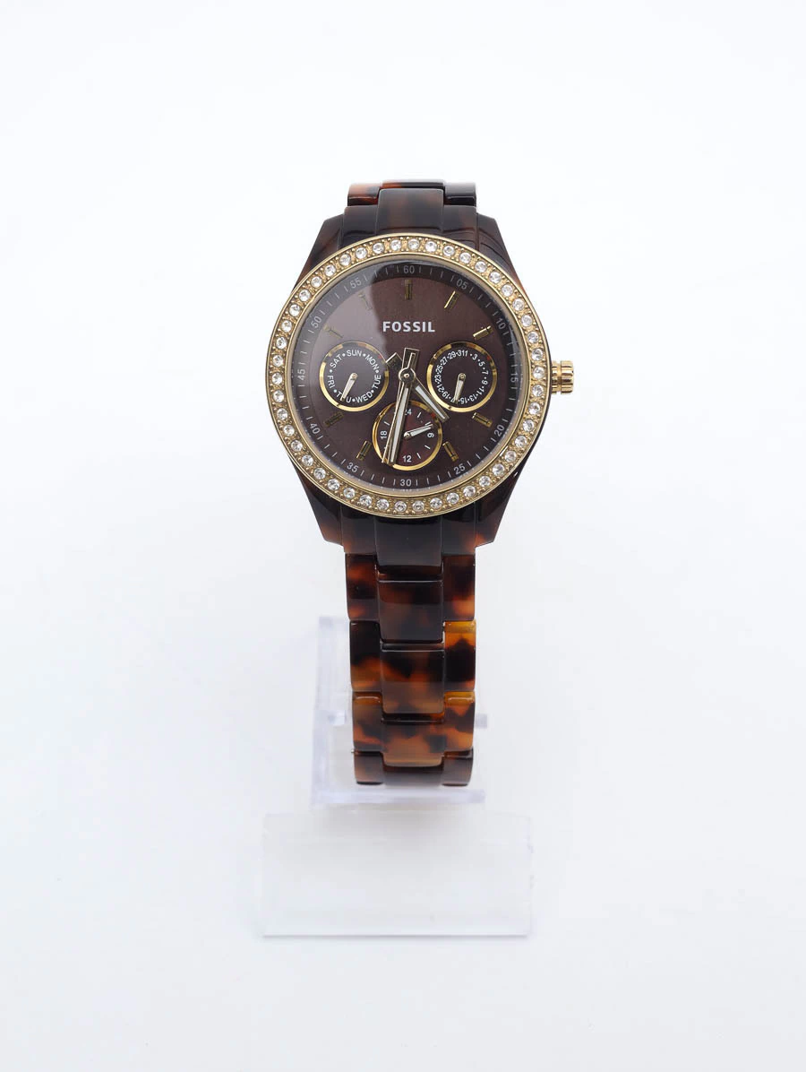 Relógio Original Fossil Elegance Cristal, com caixa redonda dourada cravejada por uma fileiras de cristais, pulseira em resina tartaruga de acabamento brilhante e mostrador marrom sofisticado. Destaque para as funções de calendário e horas, que unem elegância e praticidade ao visual.