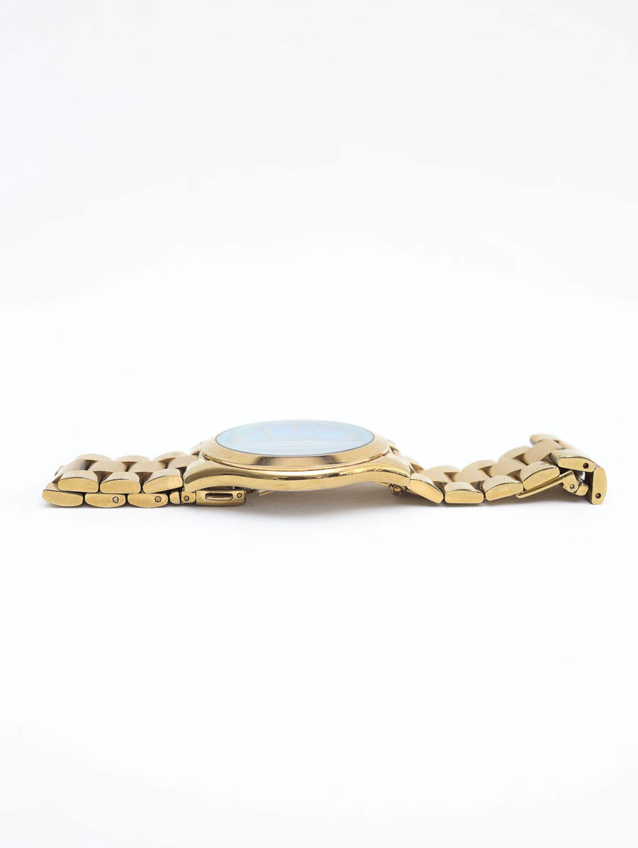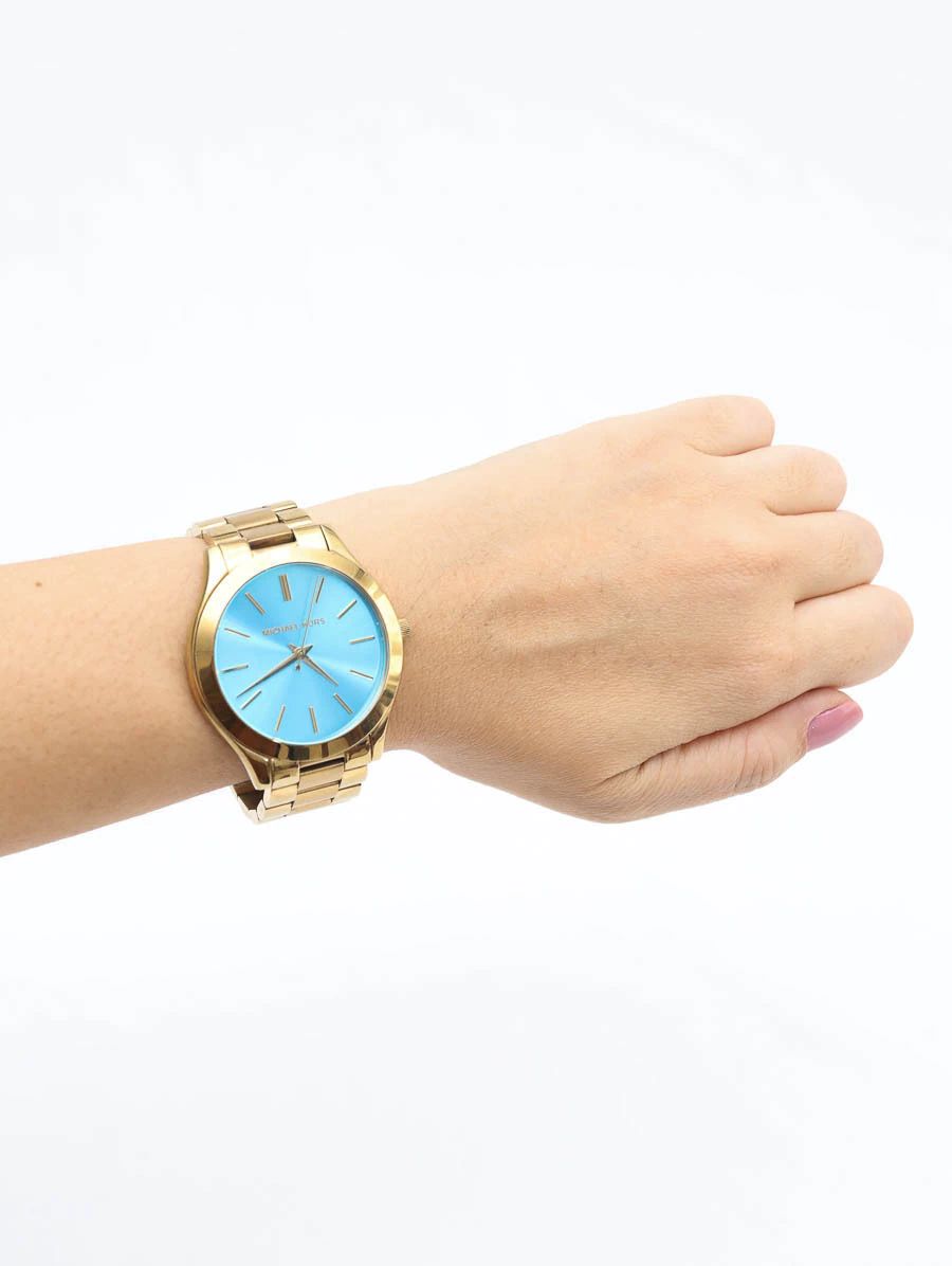 Relógio Michael Kors MK 3256 fabricado em metal dourado e modelo de caixa redonda. Possui fundo do visor azul, fecho por fivela, marcador de data, ponteiros de horas, minutos e segundos.