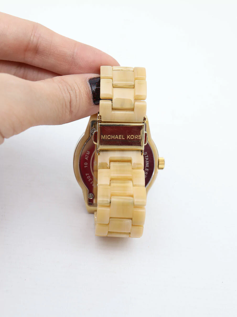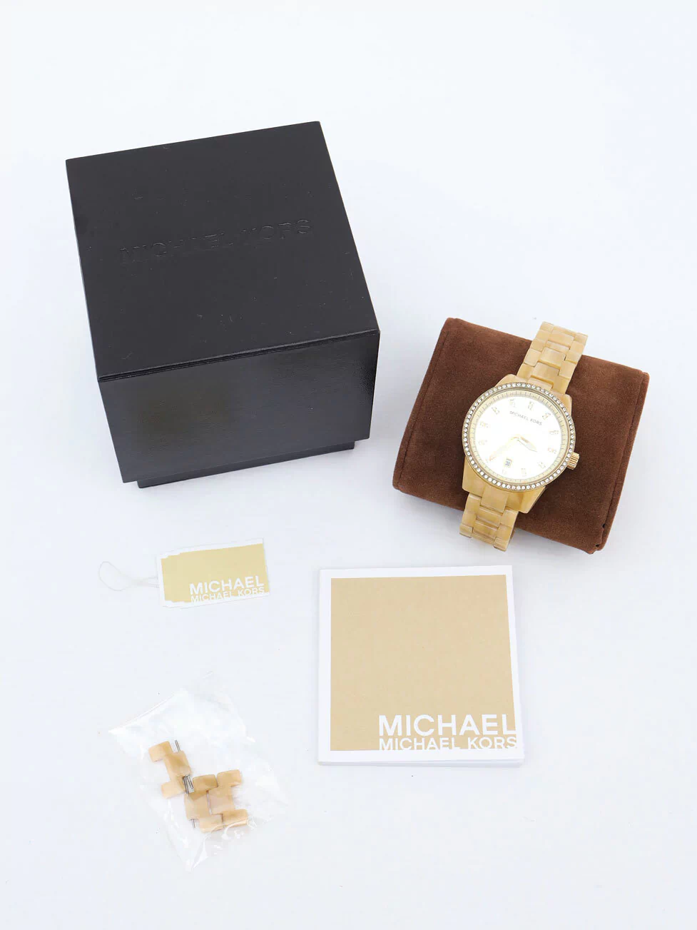 Relógio Original Michael Kors MK-5255 confeccionado em acetato e ferragens douradas. Apresenta caixa redonda com fundo dourado fosco e aplicação de strass ao redor da ciaxa. O modelo possui indicadores, ponteiro com hora, minuto e segundo e fecho por implantação.