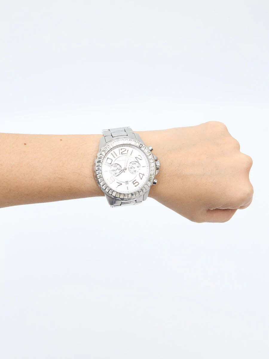 Relógio Original Michael Kors MK-5590 confeccionado em aço, caixa redonda, botões na lateral, vidro em cristal mineral, aplicações de cristais ao redor da caixa, visor com data, indicadores de horas com números, indicadores de minutos com tracinhos nas bordas e fecho por implantação. Resistência à água: 10 ATM (aproximadamente 100 metros).