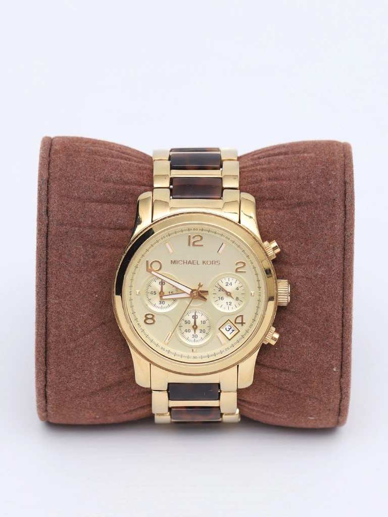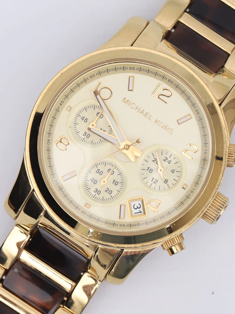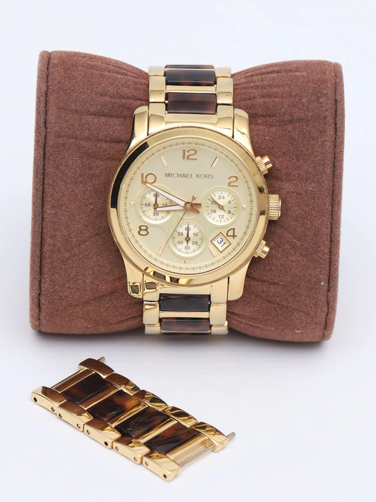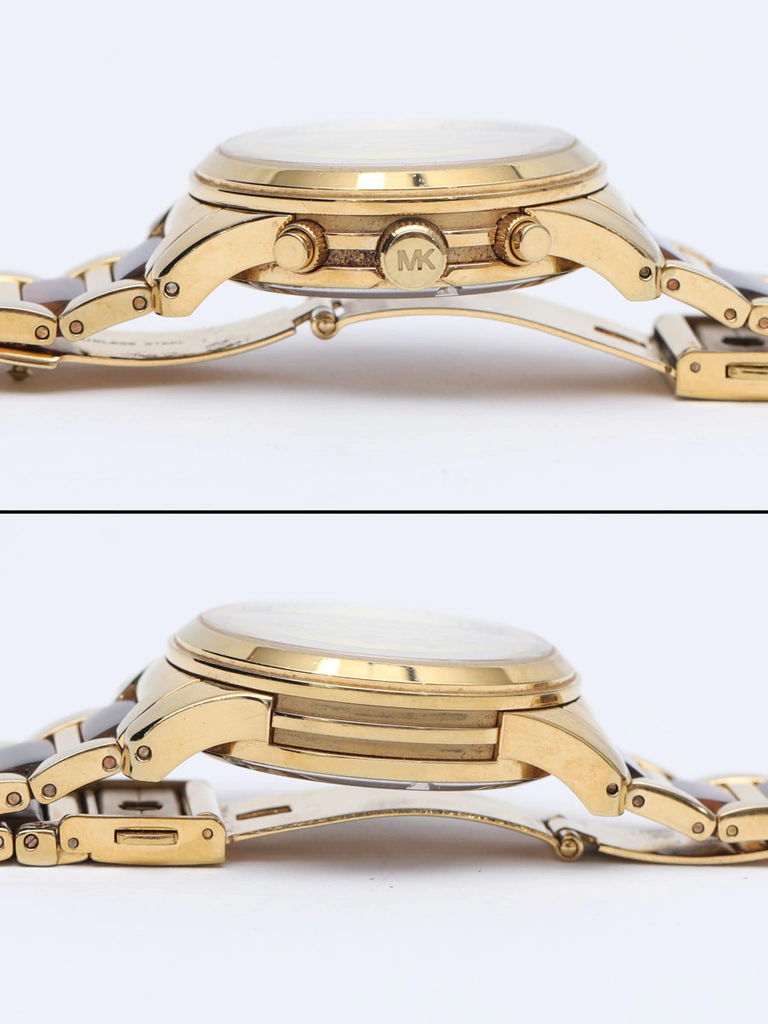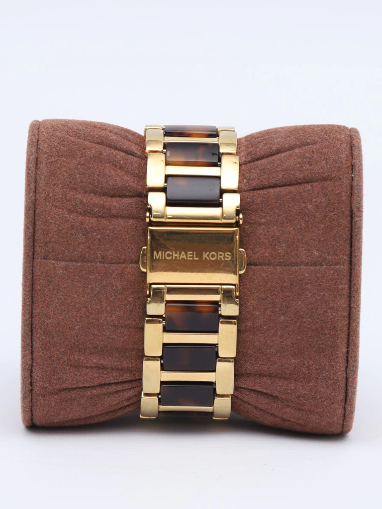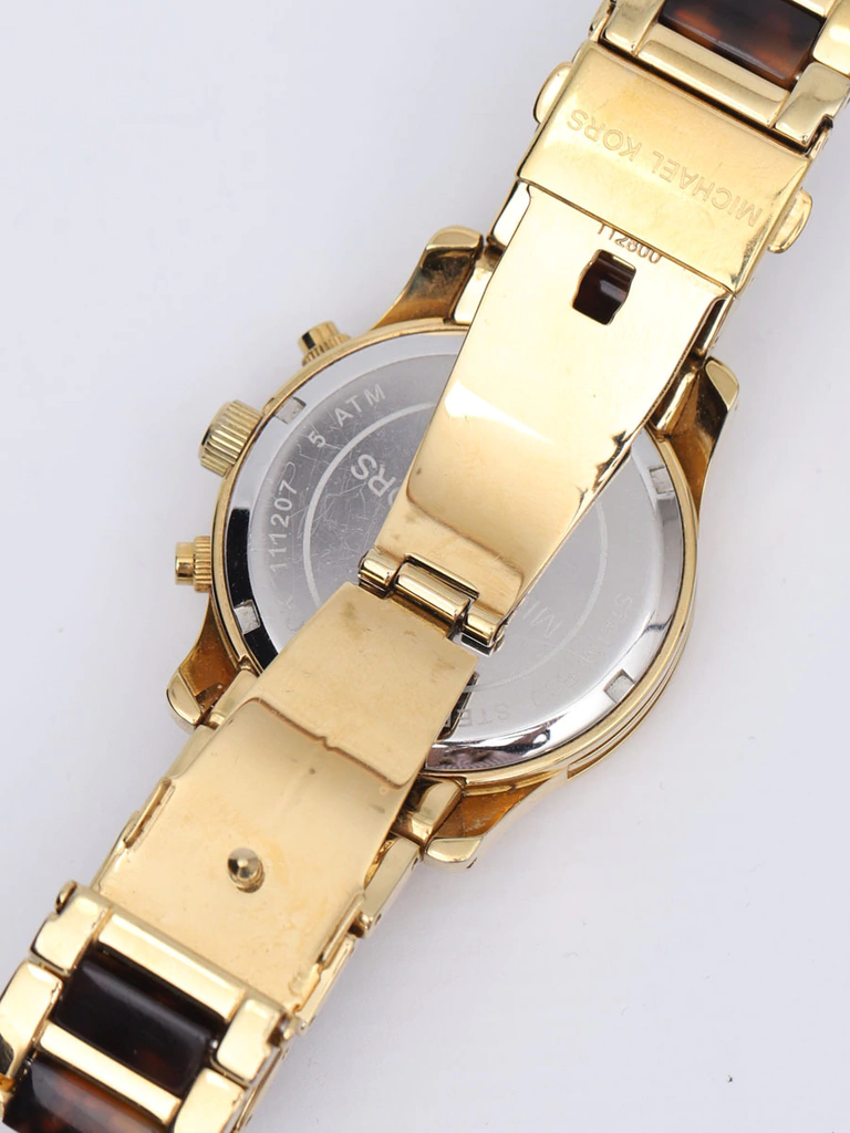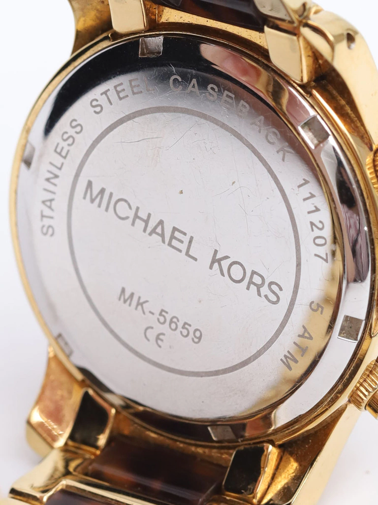 Relógio original Michael Kors MK-5659 confeccionado em aço inoxidável, pulteira com detalhes em resina em tons de marrom tartaruga, caixa redonda, botões na lateral, vidro em cristal mineral, visor com data, mostrador de horas e minutos com detalhes em branco, indicadores de horas com números, indicadores de minutos com tracinhos nas borda e fecho por implantação. Resistência à água: 5 ATM (aproximadamente 50 metros). Seminovo, em excelente estado de conservação. Apresenta mínimos risquinhos nos metais. *Não acompanha bateria.