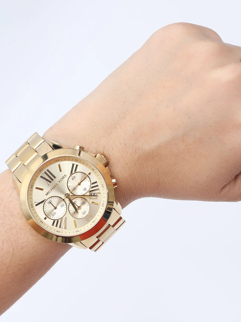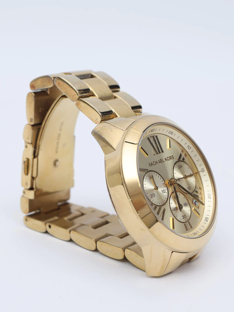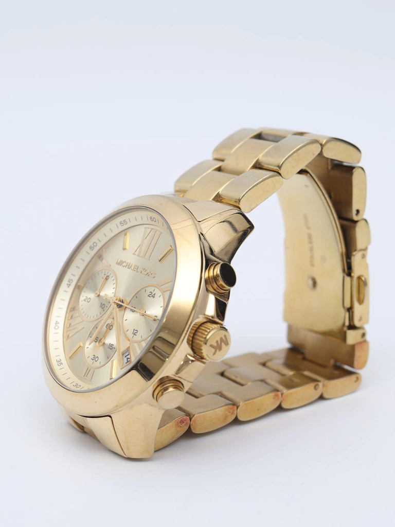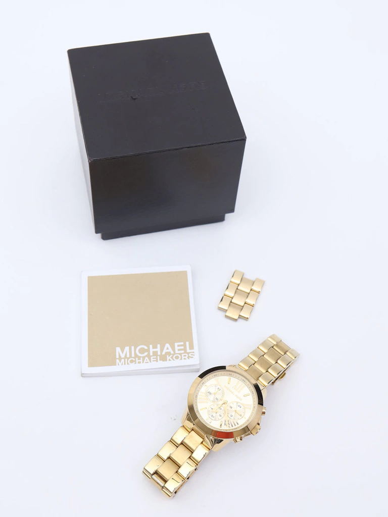 Relógio Autêntico Michael Kors MK-5777 confeccionado em aço inoxidável, caixa redonda, botões na lateral, vidro em cristal mineral, visor com data, mostrador de horas e minutos, indicadores de horas com números romanos, indicadores de minutos com tracinhos nas borda e fecho por implantação. Resistência à água: 10 ATM (aproximadamente 50 metros). Seminovo, em excelente estado de conservação. Apresenta risquinhos nos metais. *Não acompanha bateria.