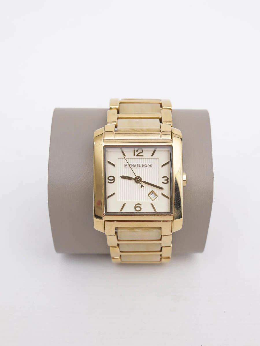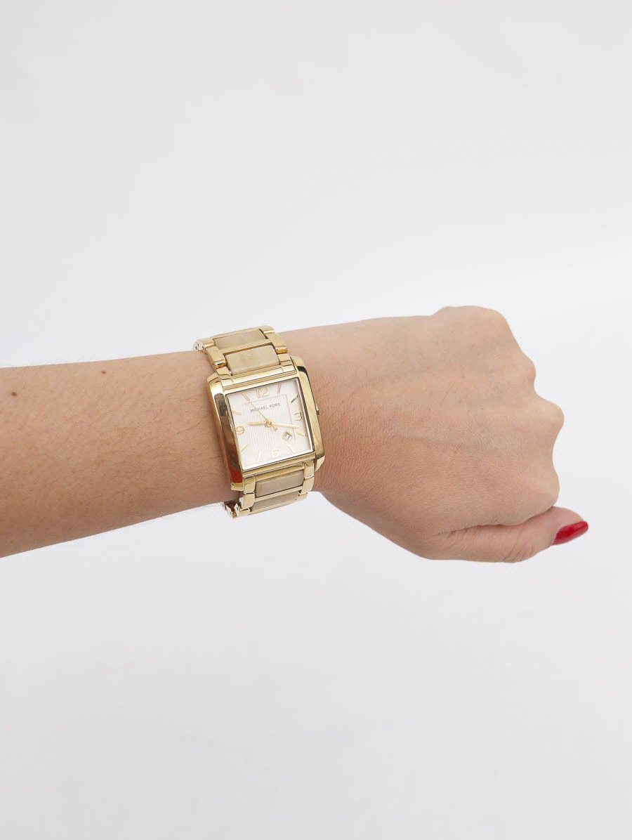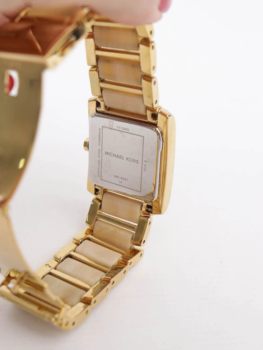 Relógio Michael Kors MK-4251 confeccionado em acetato e ferragens douradas. Apresenta caixa quadrada com fundo bege claro e detalhes em dourado. O modelo possui indicadores, ponteiro com hora, minuto e segundo e fecho por implantação.