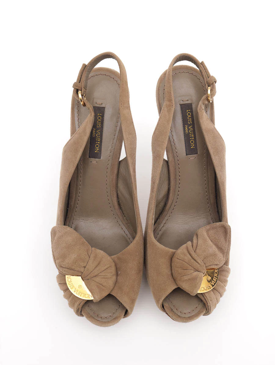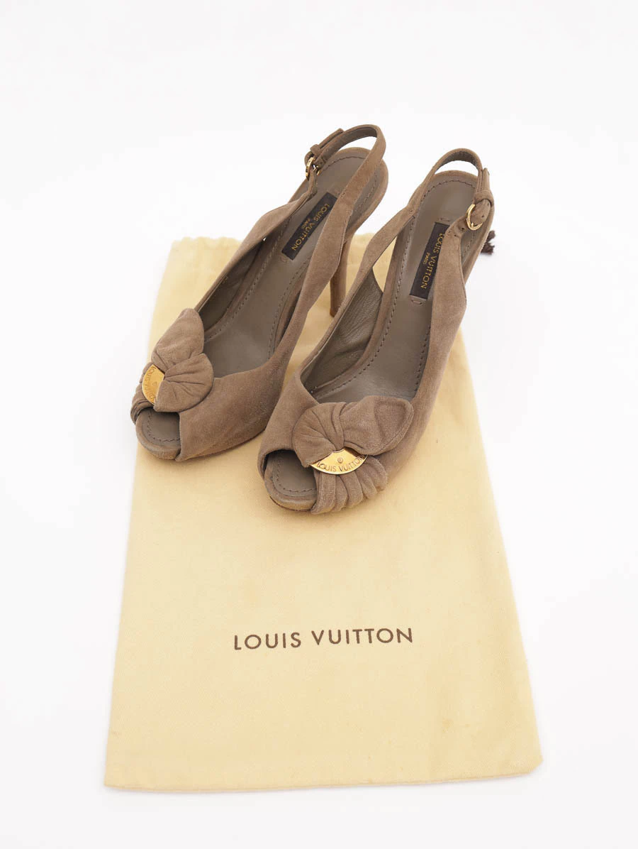 Sandália Louis Vuitton Catania Marrom - 34 BRA produzido em camurça na cor fendi e com detalhe frontal com logo Louis Vuitton.