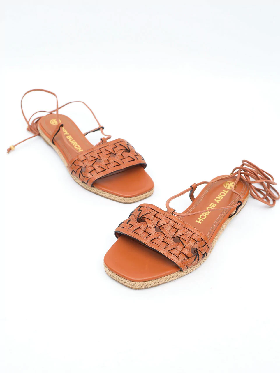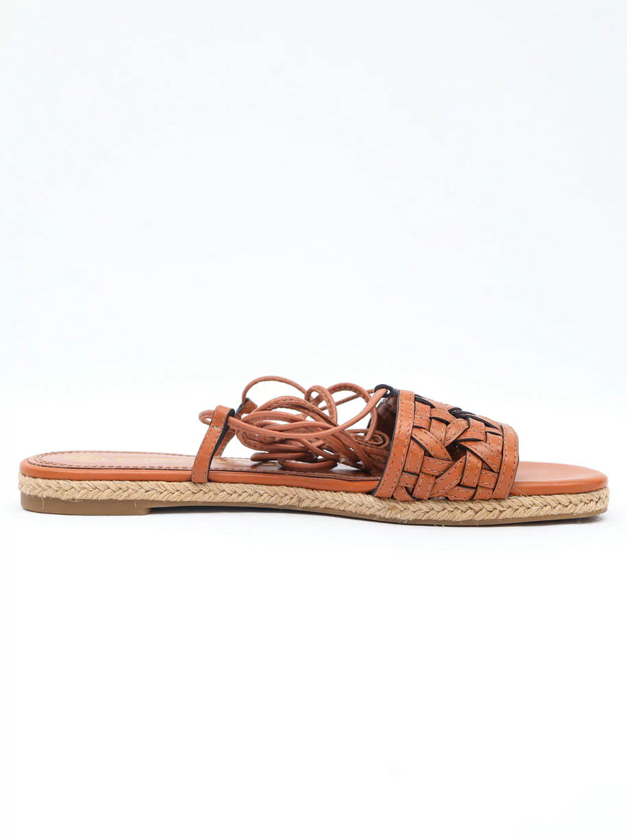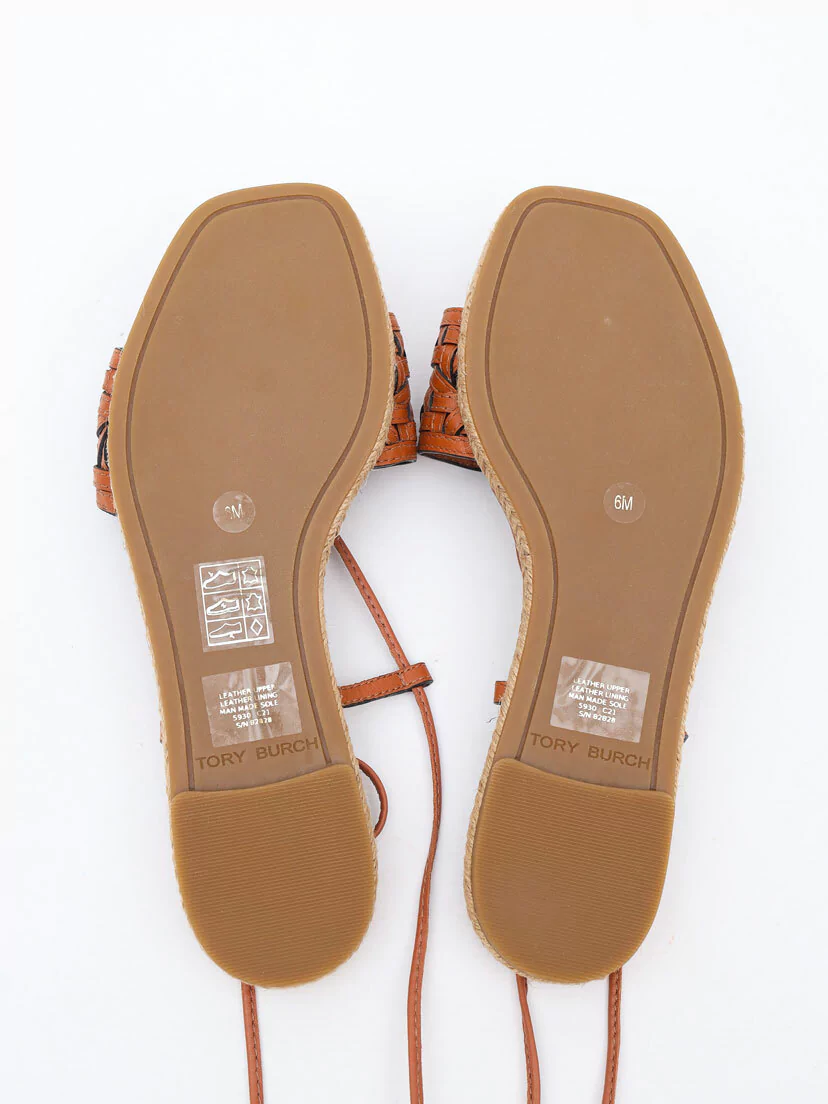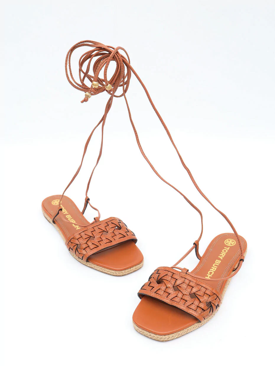 Sandália Rasteira Original Tory Burch Amarração no tamanho 36 Brasil, produzida em couro na cor marrom, salto baixo e solado em borracha, com bico quadrado. Apresenta detalhes em couro trançado no cabedal e cordão para envolver e amarrar nas pernas.