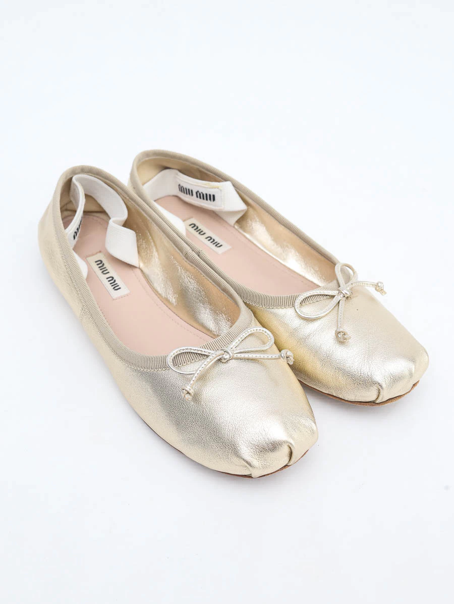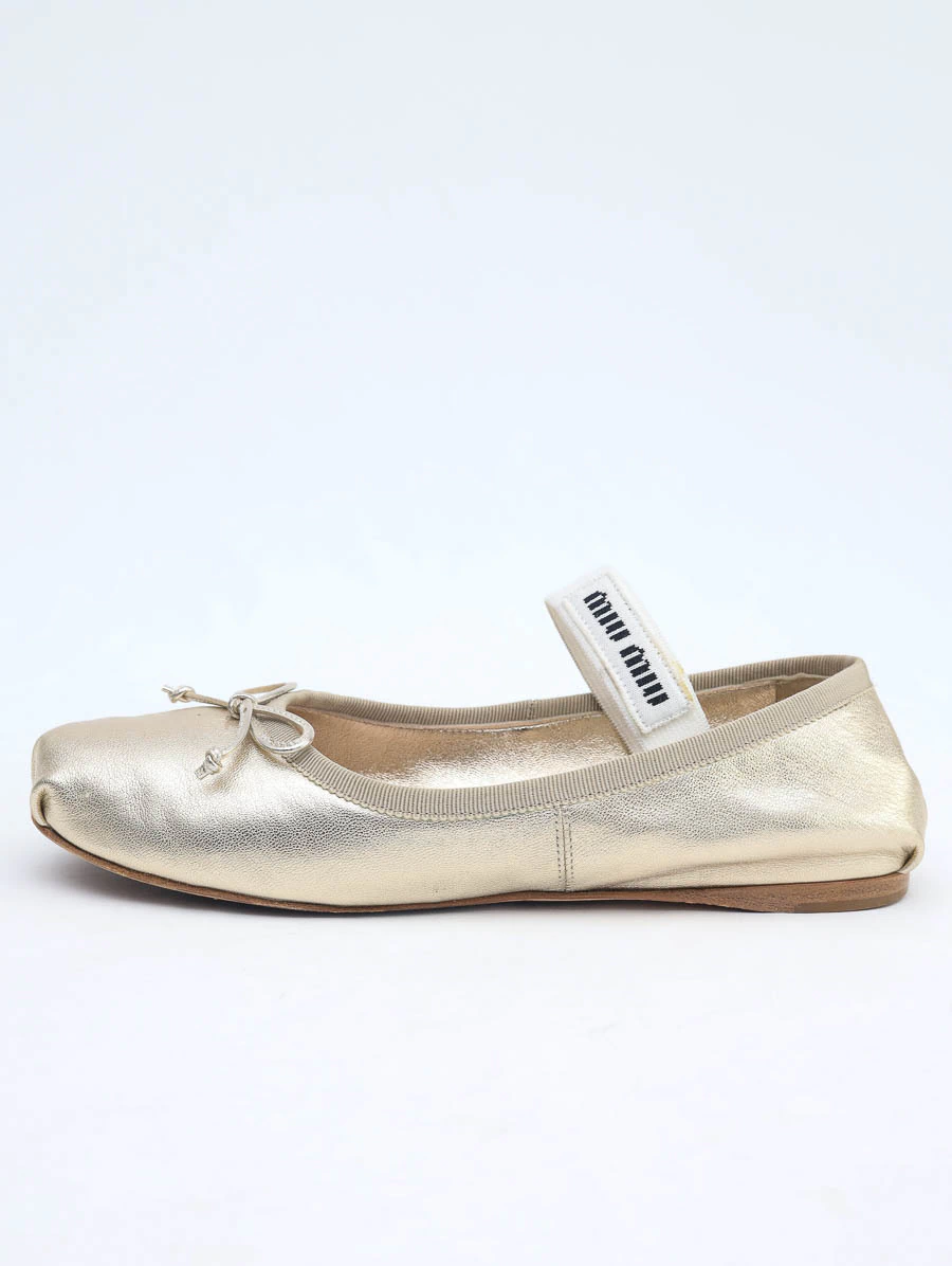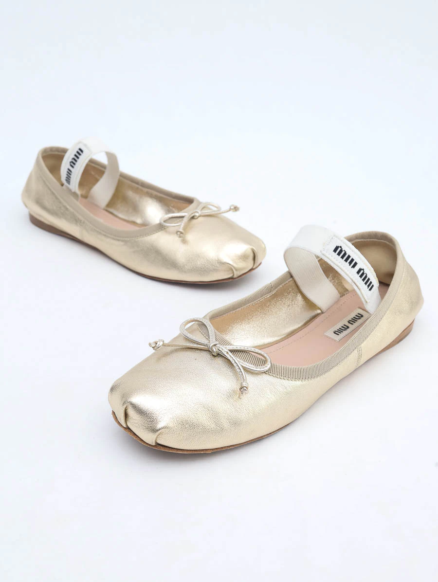 Sapatilha Miu Miu Napa Mordoré produzida em couro em tom dourado. Apresenta um laço delicado na parte frontal, elástico com logotipo da marca e palmilha revestida em couro. A peça une a elegância, o clássico e o moderno com um toque de feminilidade.