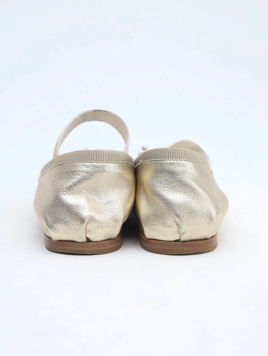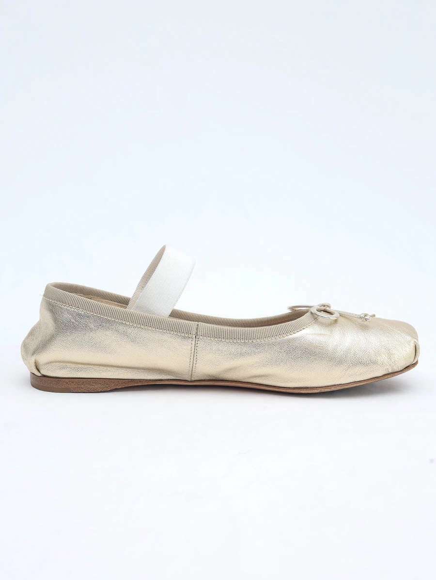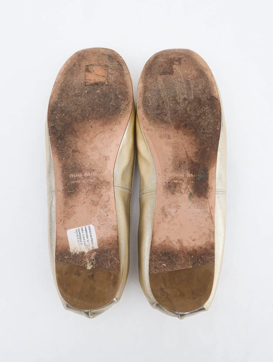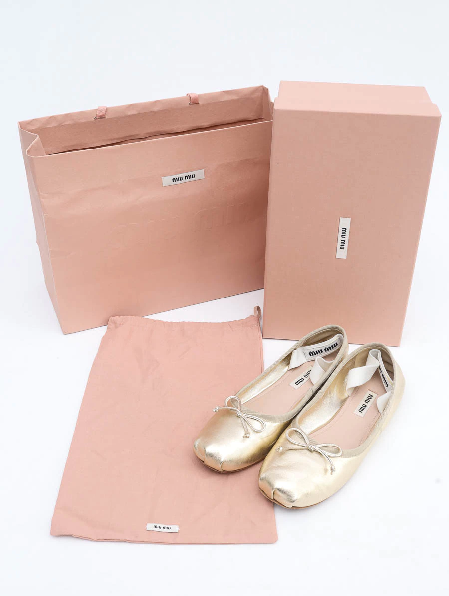 Sapatilha Miu Miu Napa Mordoré produzida em couro em tom dourado. Apresenta um laço delicado na parte frontal, elástico com logotipo da marca e palmilha revestida em couro. A peça une a elegância, o clássico e o moderno com um toque de feminilidade.