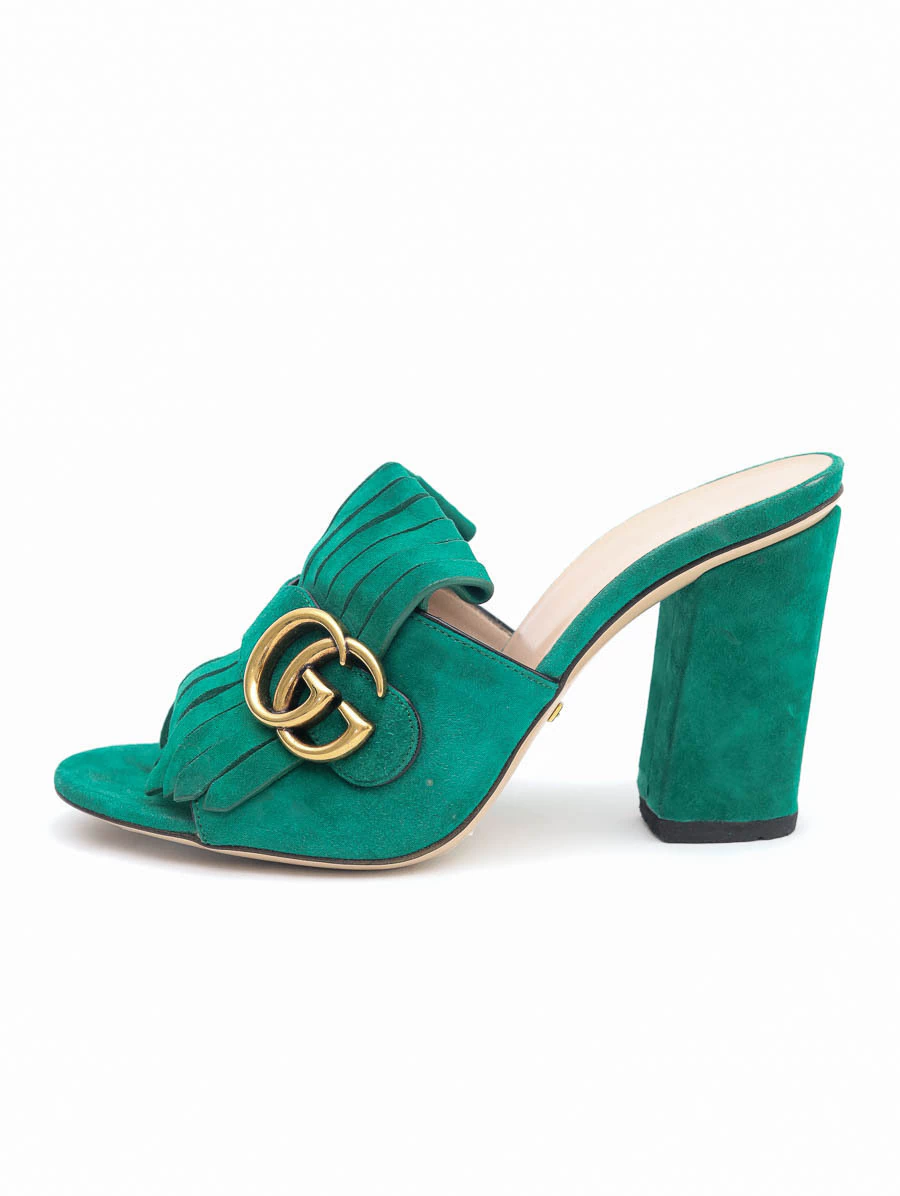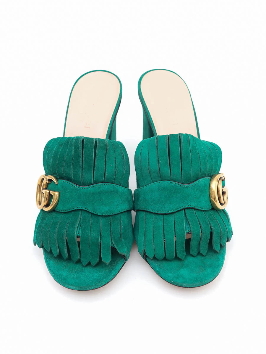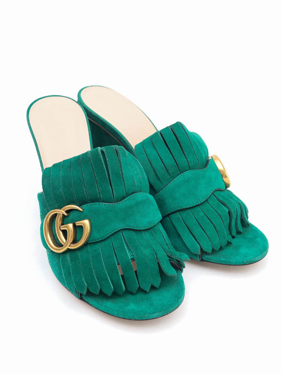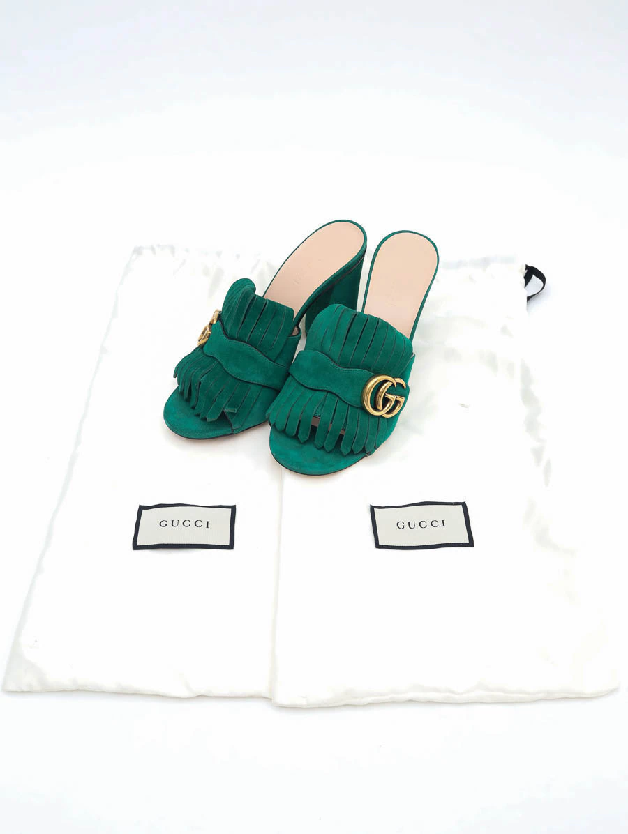 Sapato Gucci Marmont GG Suede confeccionado em suede de alta qualidade na cor verde. O destaque fica por conta do GG na parte frontal, símbolo clássico da maison italiana, aplicado em ferragem dourada e suas franjas em suede.