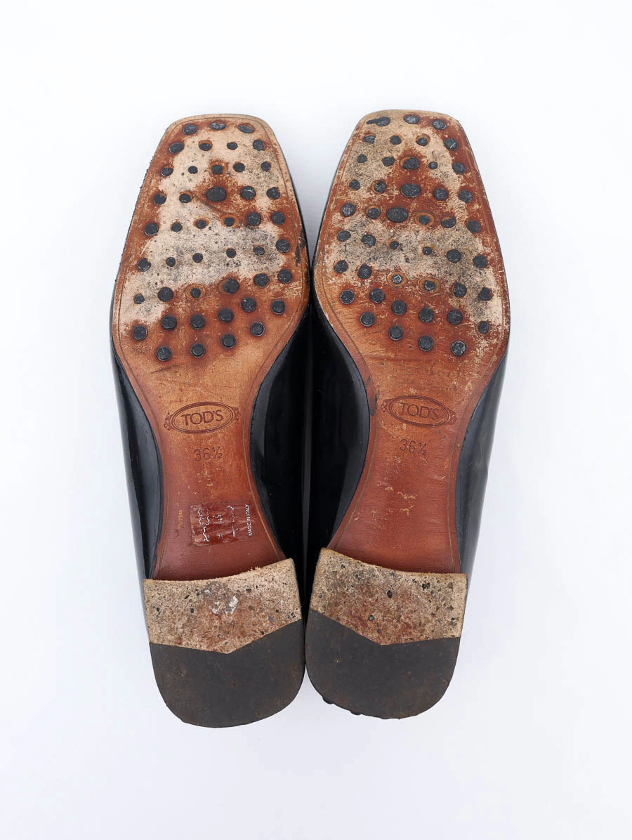 Sapato Tod's Verniz Preto confeccionado em couro envernizado com detalhe em metal prateado na parte frontal e detalhes emborrachados na parte traseira e sola da peça.