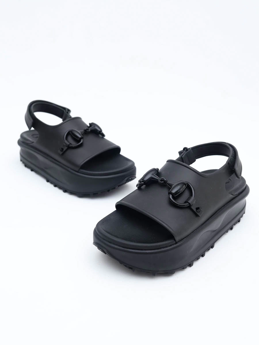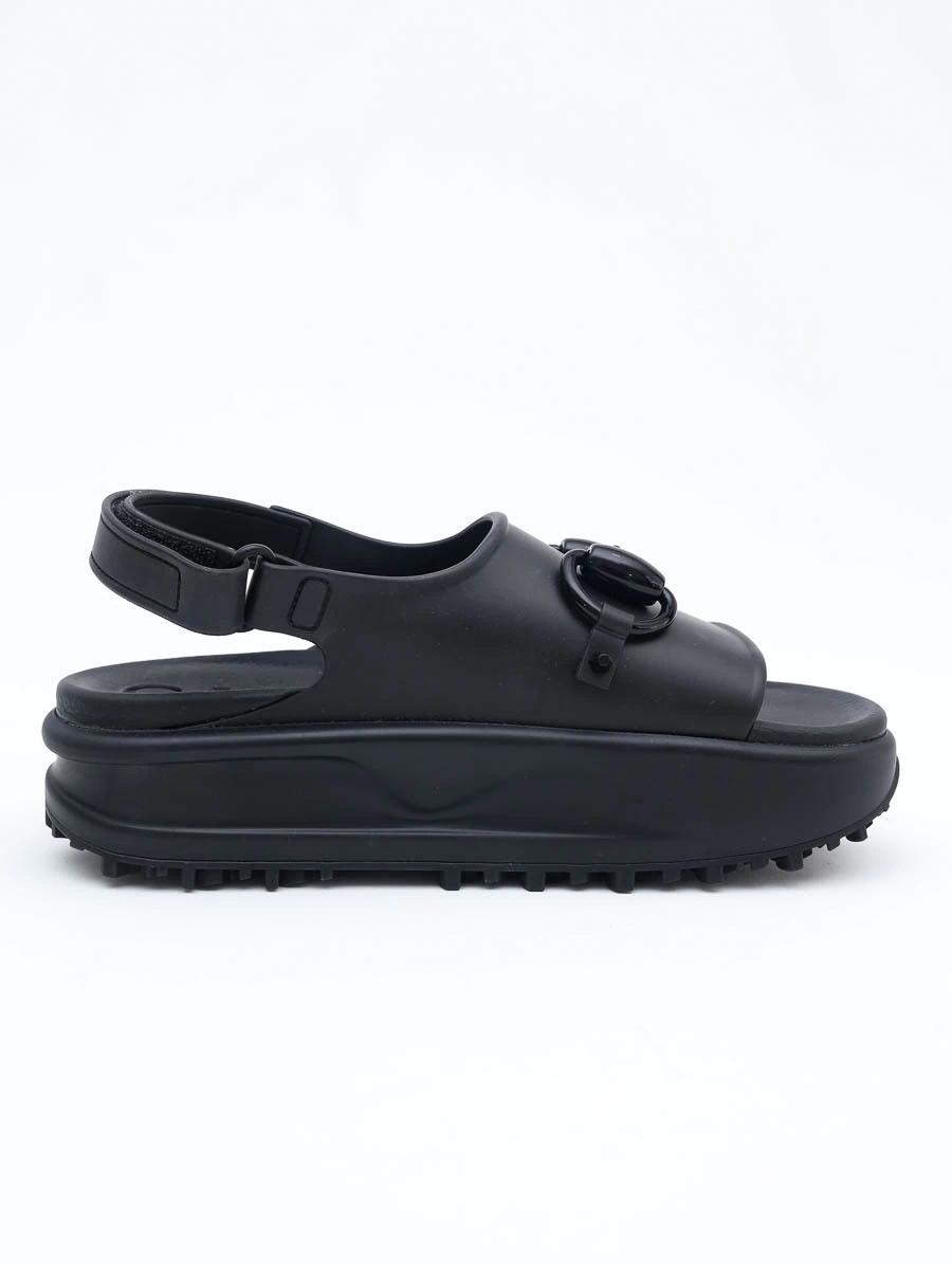 Slide Gucci Rubber Horsebit confeccionado inteiramente em borracha de alta qualidade na cor preta. O destaque fica por conta do emblemático detalhe horsebit (ferradura), símbolo clássico da maison italiana, aplicado em tom sobre tom, que confere identidade e sofisticação ao design minimalista.A palmilha anatômica e a sola plataforma robusta oferecem conforto extremo e estilo contemporâneo, ideal para composições urbanas, casuais ou fashionistas.