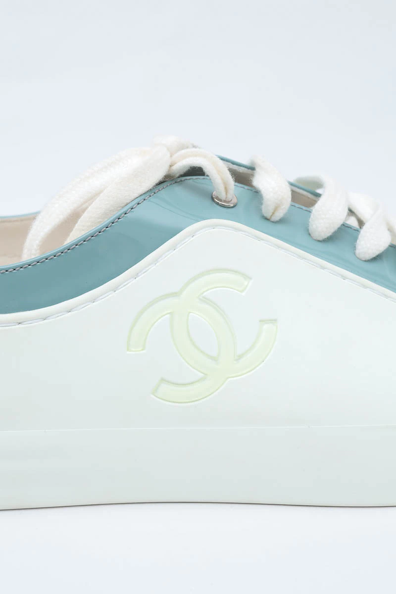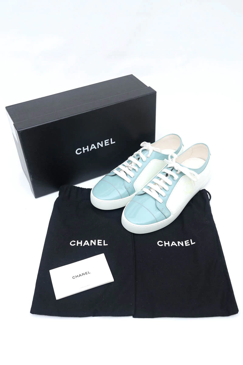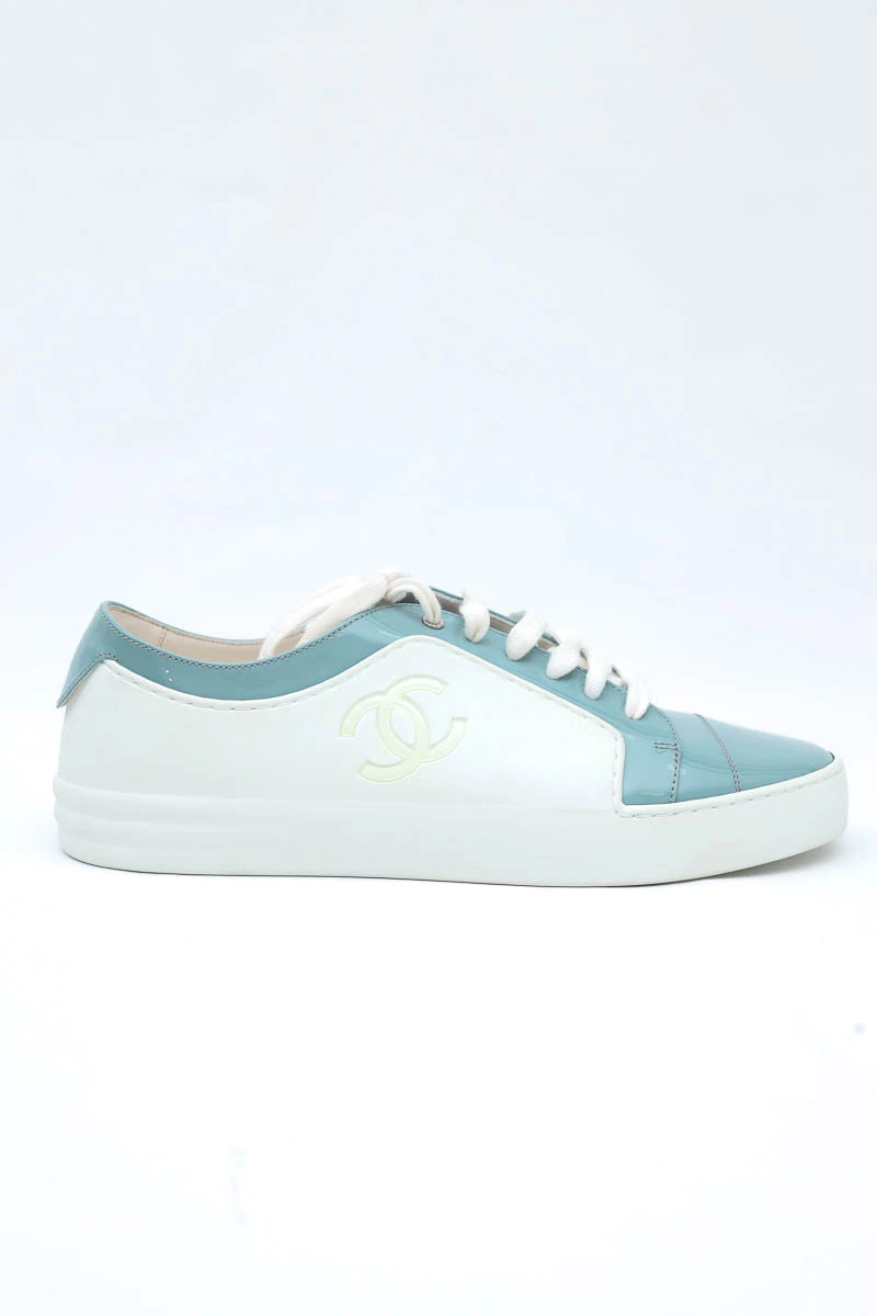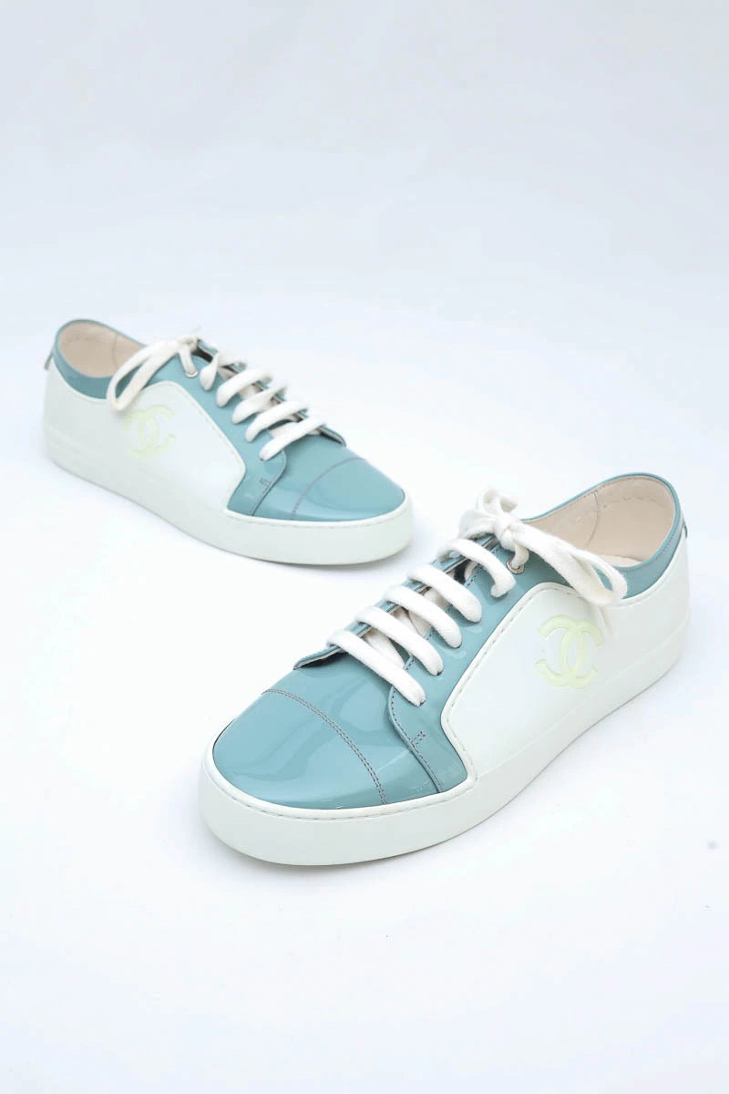 Tênis Chanel Verniz Bicolor produzido em couro e verniz no tamanho 38 Brasil, nas cores branco com detalhes em azul claro.