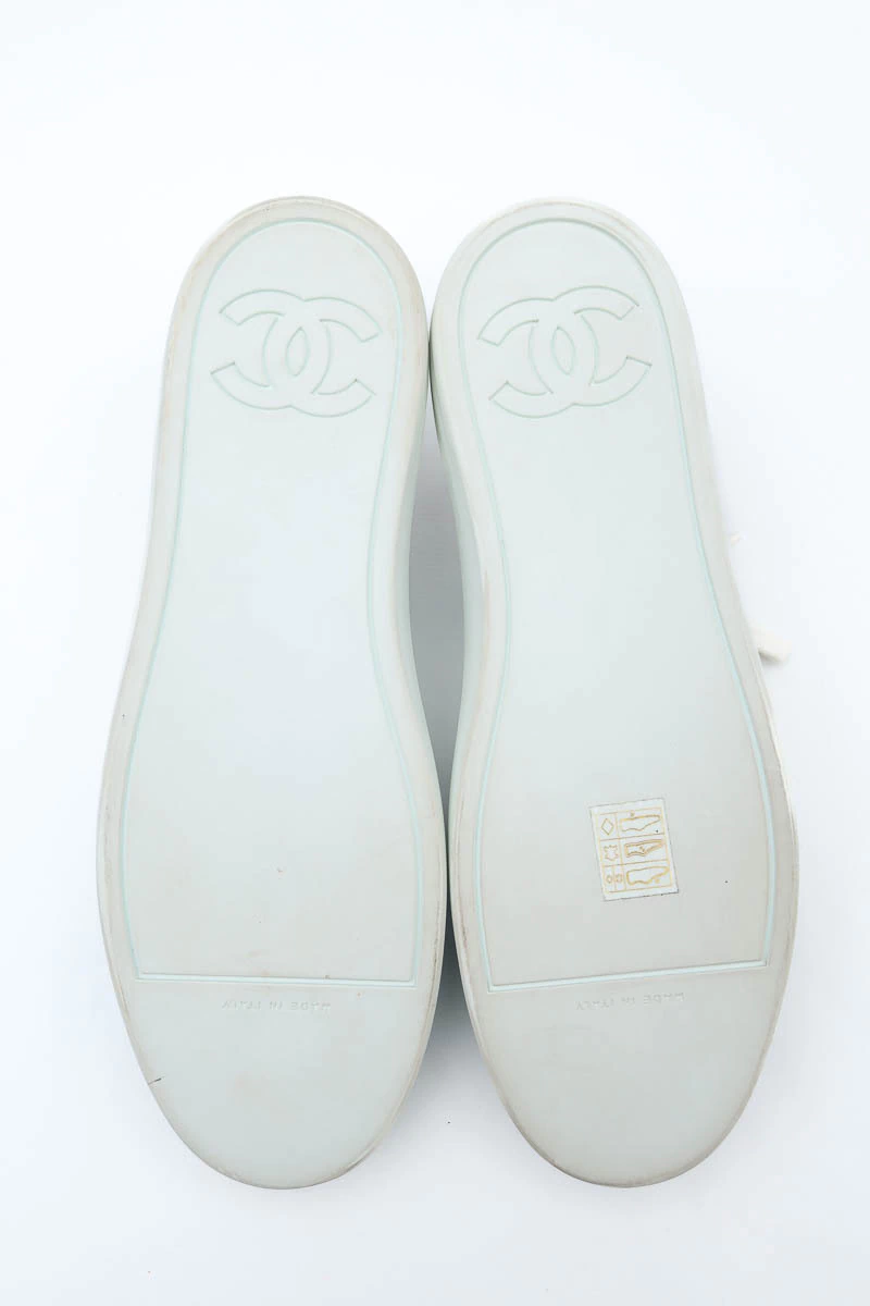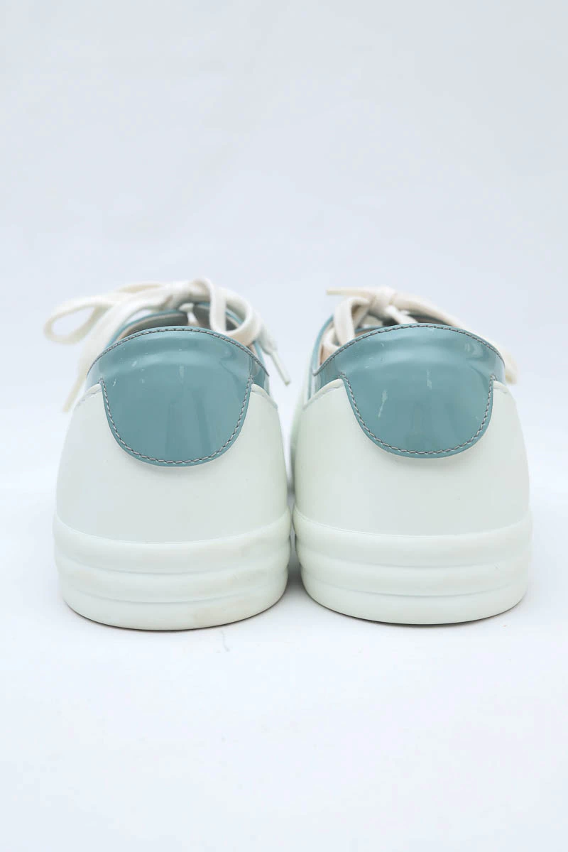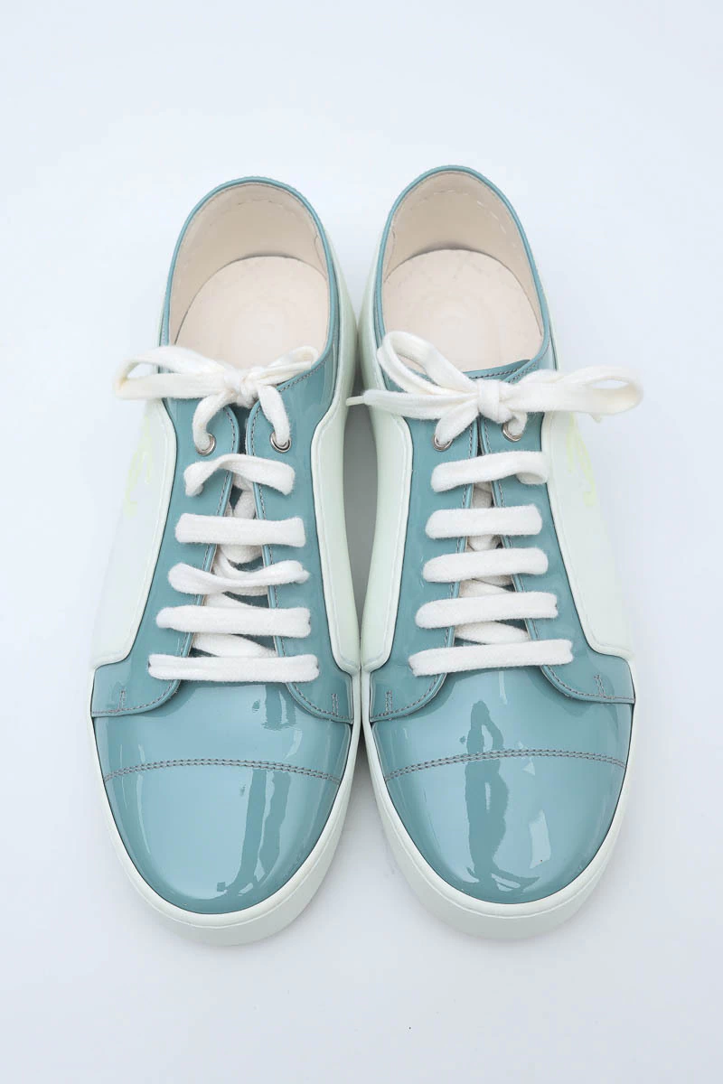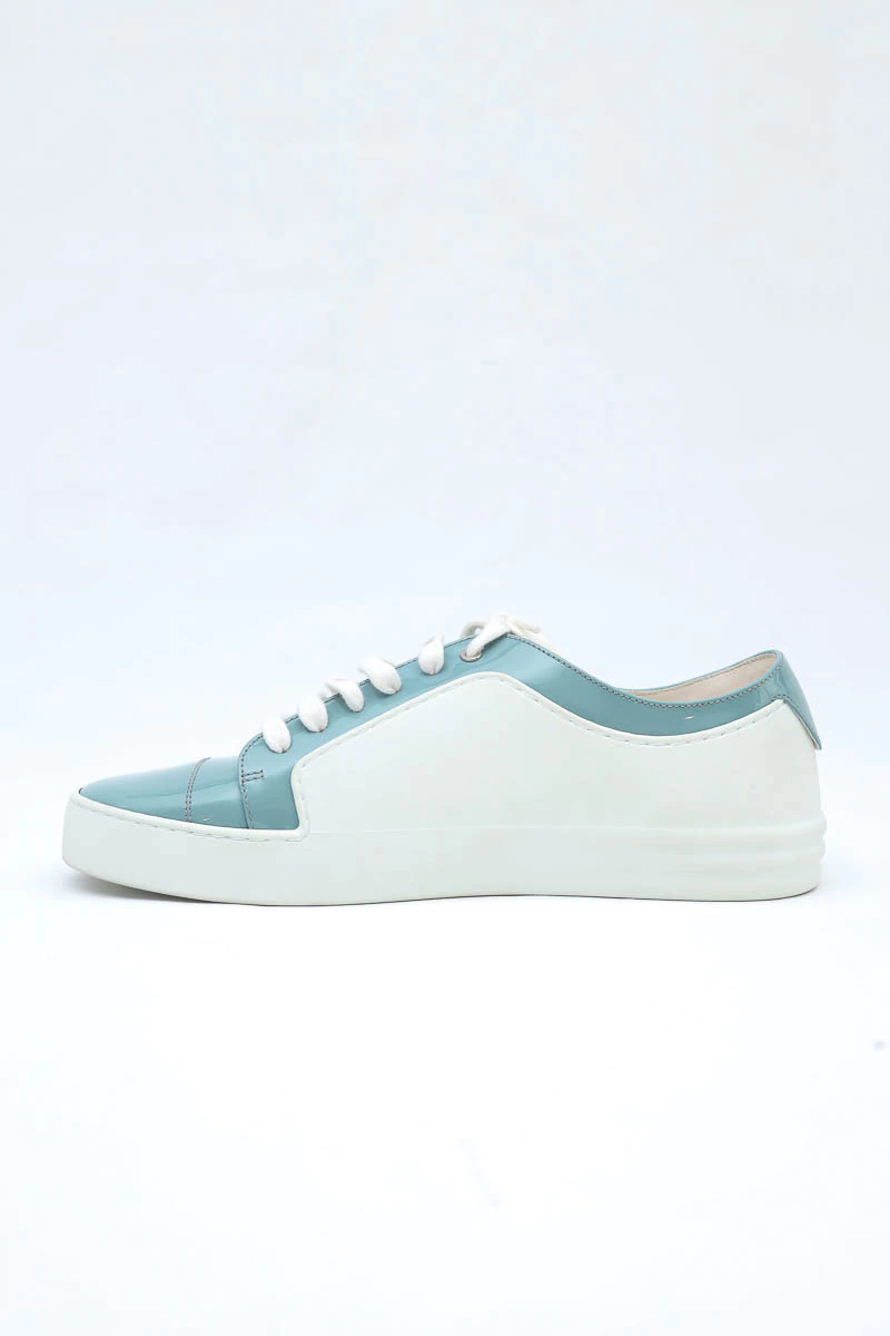Tênis Chanel Verniz Bicolor produzido em couro e verniz no tamanho 38 Brasil, nas cores branco com detalhes em azul claro.