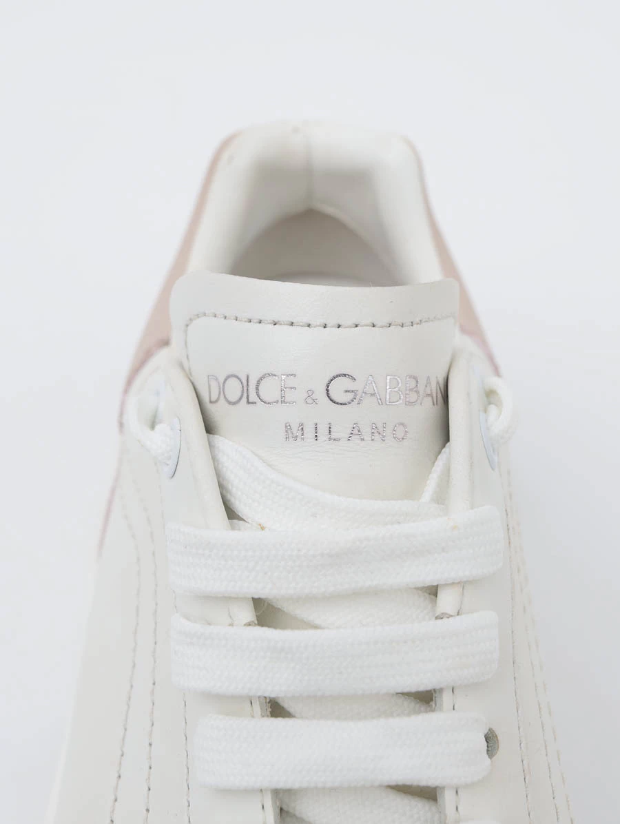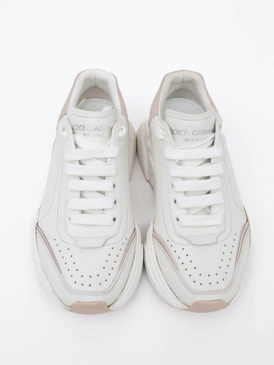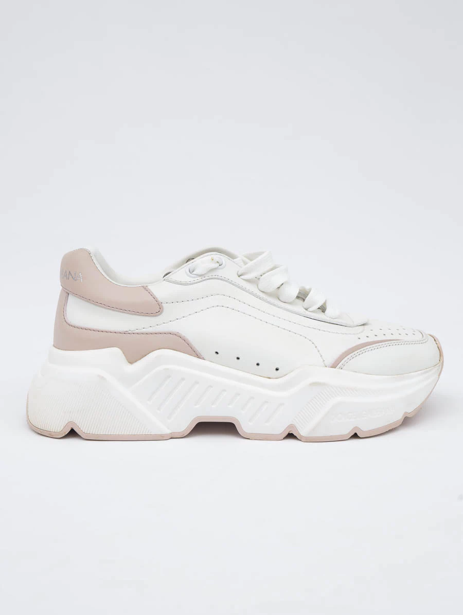 Tênis Seminovo Original Dolce Gabanna Daymaster produzido em couro no tamanho 35 Brasil, nas cores branco com detalhes em rosa claro.