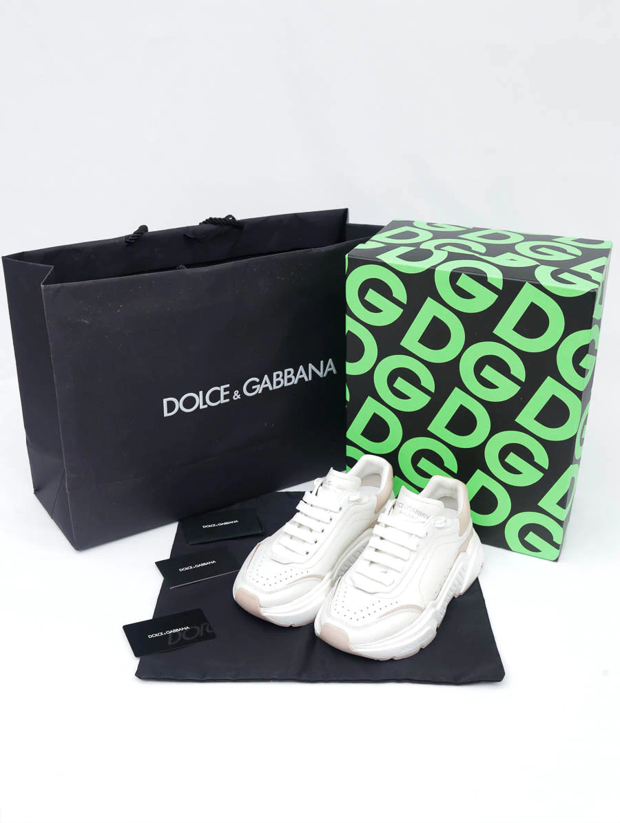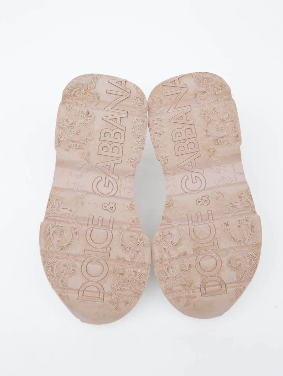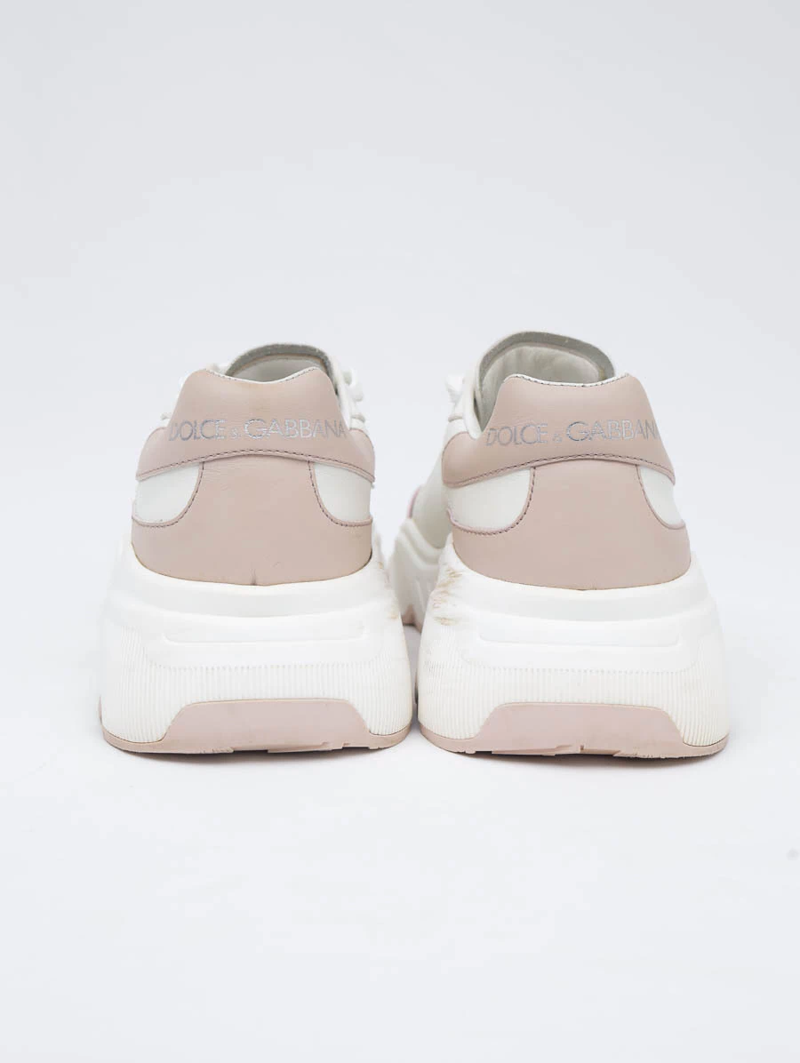 Tênis Seminovo Original Dolce Gabanna Daymaster produzido em couro no tamanho 35 Brasil, nas cores branco com detalhes em rosa claro.