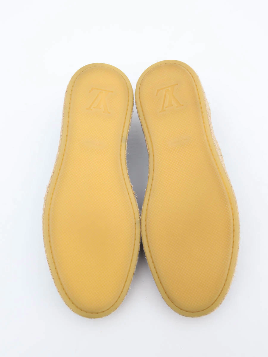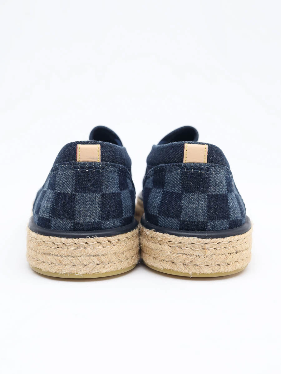 Tênis Louis Vuitton Denim Damier Coconut Grove produzido em couro vachetta, denim azul com detalhe em damier e sola com sisal bege no tamanho 40 Brasil.
