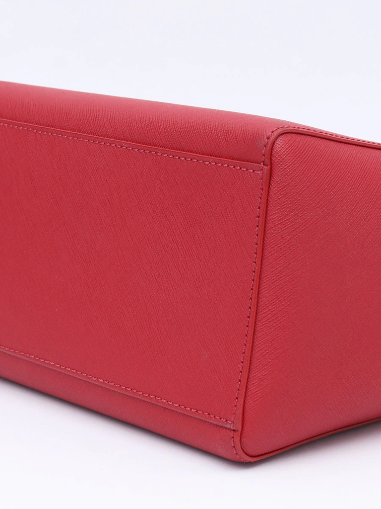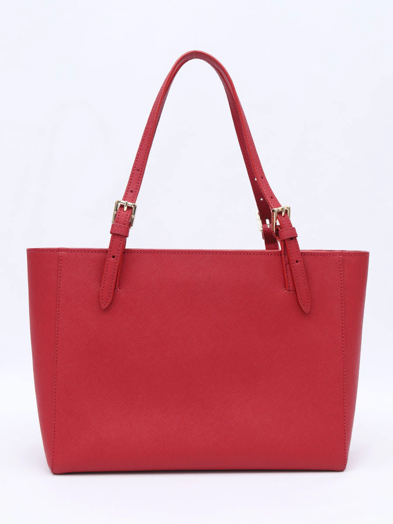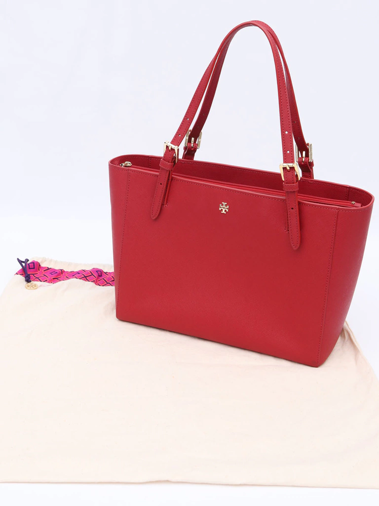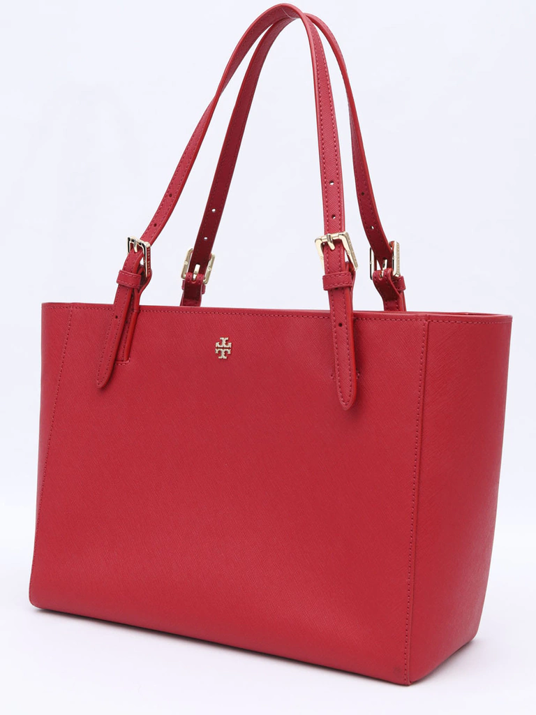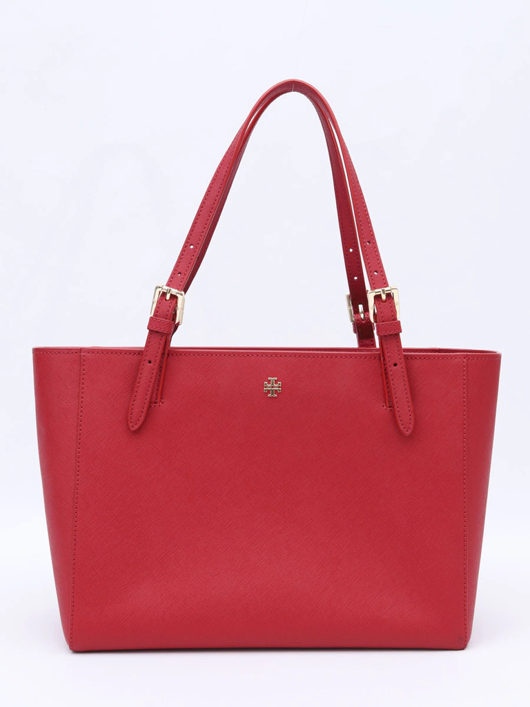 Bolsa Autêntica Tory Burch Emerson Buckle Tote Saffiano produzida em couro saffiano vermelho e metais dourados. Apresenta confortáveis alças de ombro com regulagem de comprimento, interior dois compartimentos abertos e uma divisória central com zíper, quatro bolsos abertos e um bolso maior com zíper. Prática, leve e muito confortável, o modelo é ideal para quem está procurando uma bolsa para uso diário.